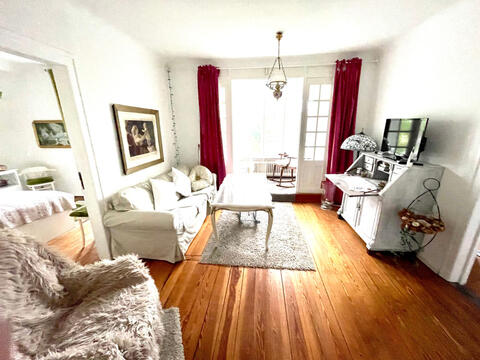 Große romantische Gründerzeit-Ehebetten, gemütliche Sitzecke mit TV Radio. 22 m² groß.