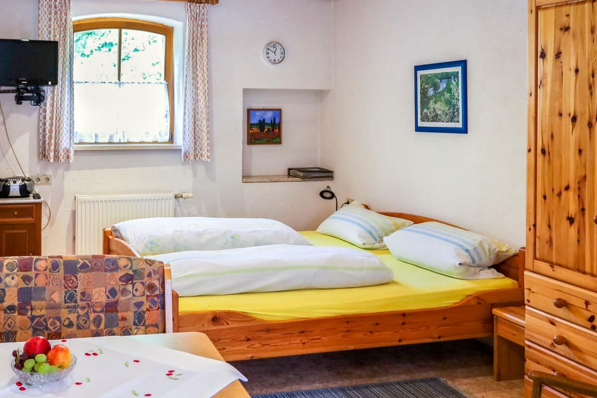 "Schweinestall" und "Taubenschlag" sind unsere Studios für Zwei. "Kuhstall" und "Heuboden" haben zwei Schlafzimmer. Hier können bis zu fünf Personen wohnen. Unser "Hühnernest" ist mit zwei Bädern ausgestattet und bietet Platz für sechs Personen. Unsere gemütlichen Wohnungen sind komfortabel eingerichtet und ausgestattet: Komplett ausgestattete Küche (zum Teil mit Spülmaschine) TV und CD-Player mit Radio Bettwäsche und Handtücher Für unsere kleinen Gäste stellen wir auch gerne ein Kinderbett auf Freundliche, helle Doppelzimmer mit Dusche und WC und reichhaltigem Bauernfrühstück.