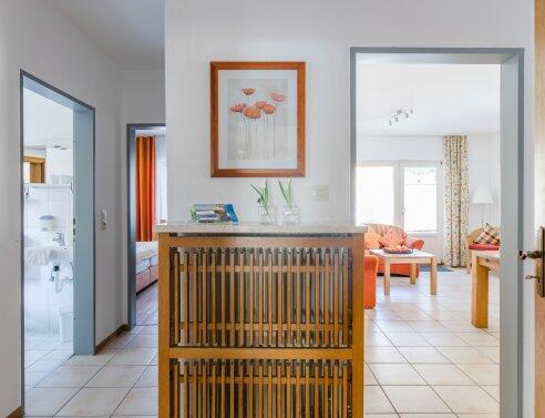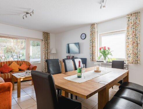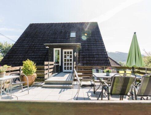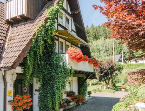 Unmittelbar am Fuße der Homert (656 m ü. NN) in absolut ruhiger Südhanglage - direkt am Wald - liegt unser Appartmenthaus mit 2 separaten Wohnungen (Typ B - ebenerdig 60 qm mit direktem Zugang zur Liegewiese mit Kneipp-Tretbecken und einem Grillplatz mit Grillkamin und Typ G 70 qm in der 1. und 2. Etage gelegen und über eine Außentreppe zu erreichen mit eigener Terrasse mit Grillkamin. Beide Appartments sind einzeln oder zusammen anzumieten. Jedes dieser App. hat 2 bzw. 3 Doppel-Schlafzimmer für 4 - 7 Personen (Zusatzbett) - 1 Küche - 1 Wohnzimmer mit Essecke - 1 Dusche - 1 Terrasse mit Grillkamin und in Typ G zusätzlich noch eine Infrarotsauna (Saunatücher werden nicht gestellt, können aber angemietet werden).