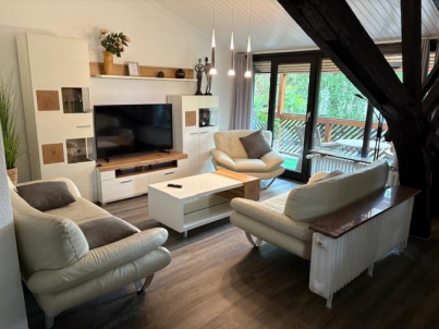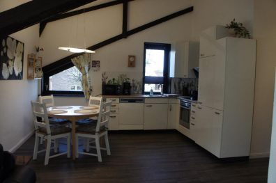 Für 2-4 Personen, 65 qm, Wohnzimmer mit Schlafempore, Einbauküche, Essplatz, Schlafzimmer, Dusche/WC und Balkon.