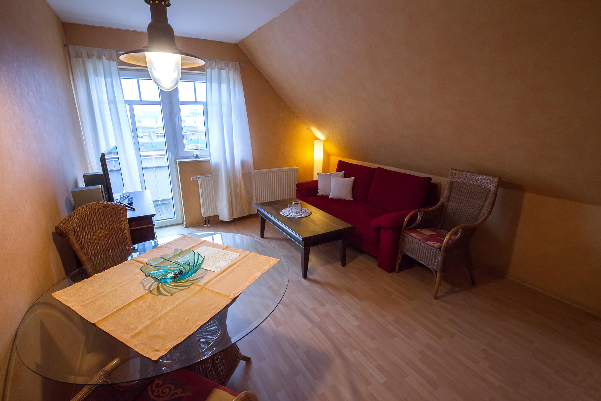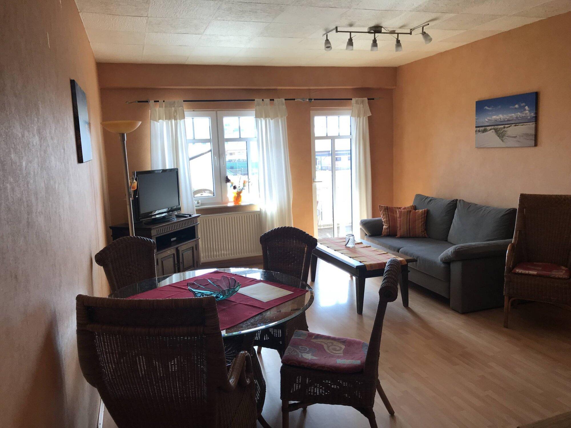 Unsere Ferienwohnung befindet sich im ersten Obergeschoss und ist für bis zu 6 Personen konzepiert. Sie besteht aus einem Schlafzimmer mit Doppelbett, einem mit zwei Einzelbetten. Ein Duschbad und einem Wohn-Küchenbereich vervollständigen die Wohnung. Ein Fahrradständer befindet sich am Haus.