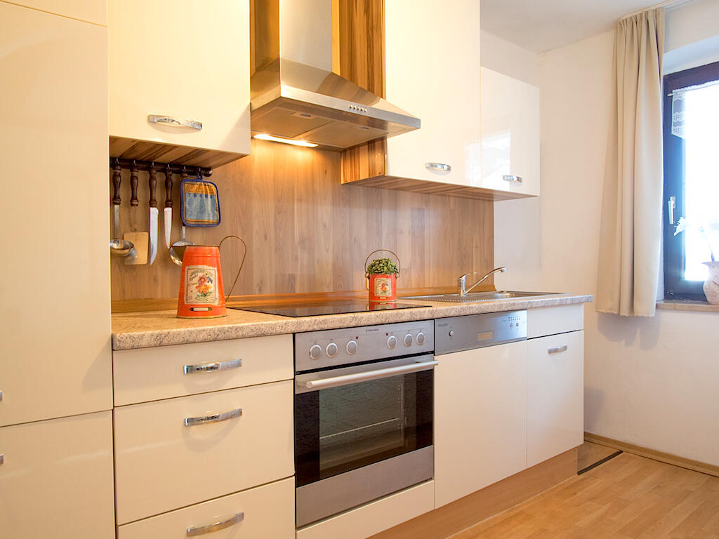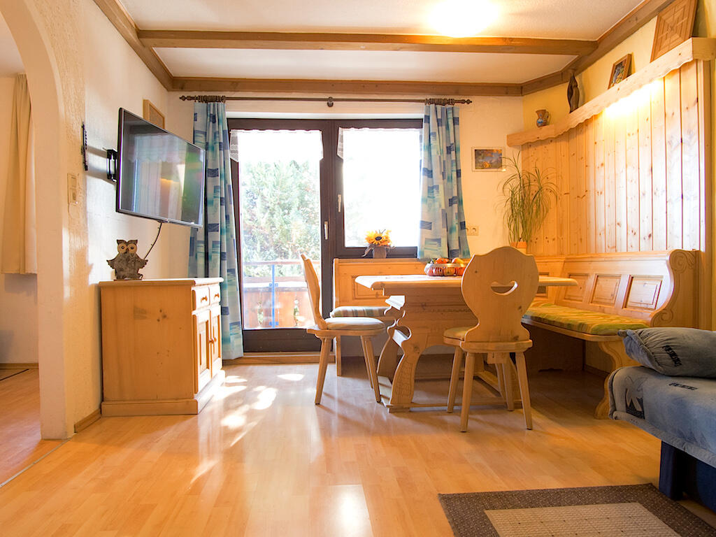 2,5-Zimmer-Ferienwohnung Wohnraum mit Küchenzeile, Sitzecke und Couch, 1 Schlafzimmer mit Ehebett, 1 Durchgangszimmer (Kinderzimmer) mit Futonbett 1,40 m breit, Dusche/WC, 1. Stock mit Blick auf die Berge und der Zugspitze sowie einer eigenen Terrasse für diese Wohnung, ca. 50 qm bis 4 Personen, Kinderbett und Hochstuhl vorhanden.