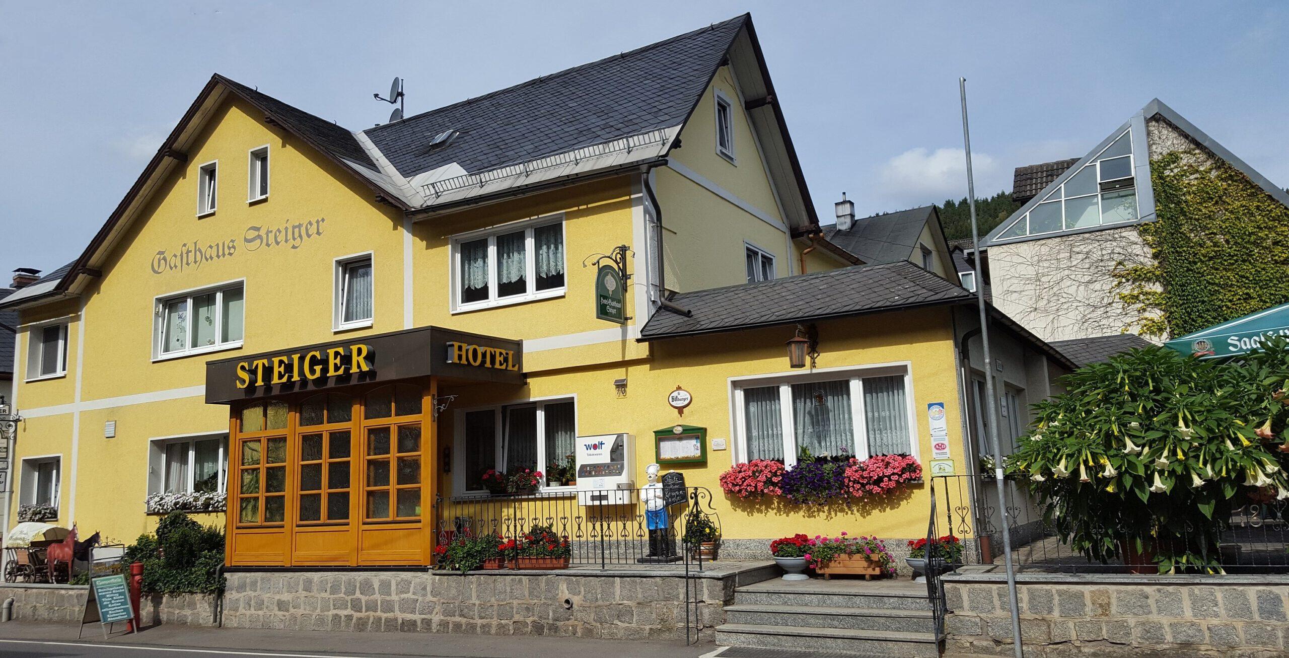 Herzlich Willkommen bei Ihrem Thüringer 3-Sterne Hotel-Gasthaus Steiger. Unser Hotel liegt in ruhiger Ortslage von Gräfenthal / Gebersdorf in der Nähe des Rennsteigs an der Thüringer Porzellanstraße und der Bier- und Burgenstraße