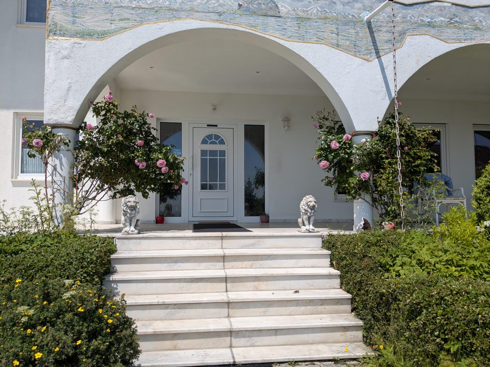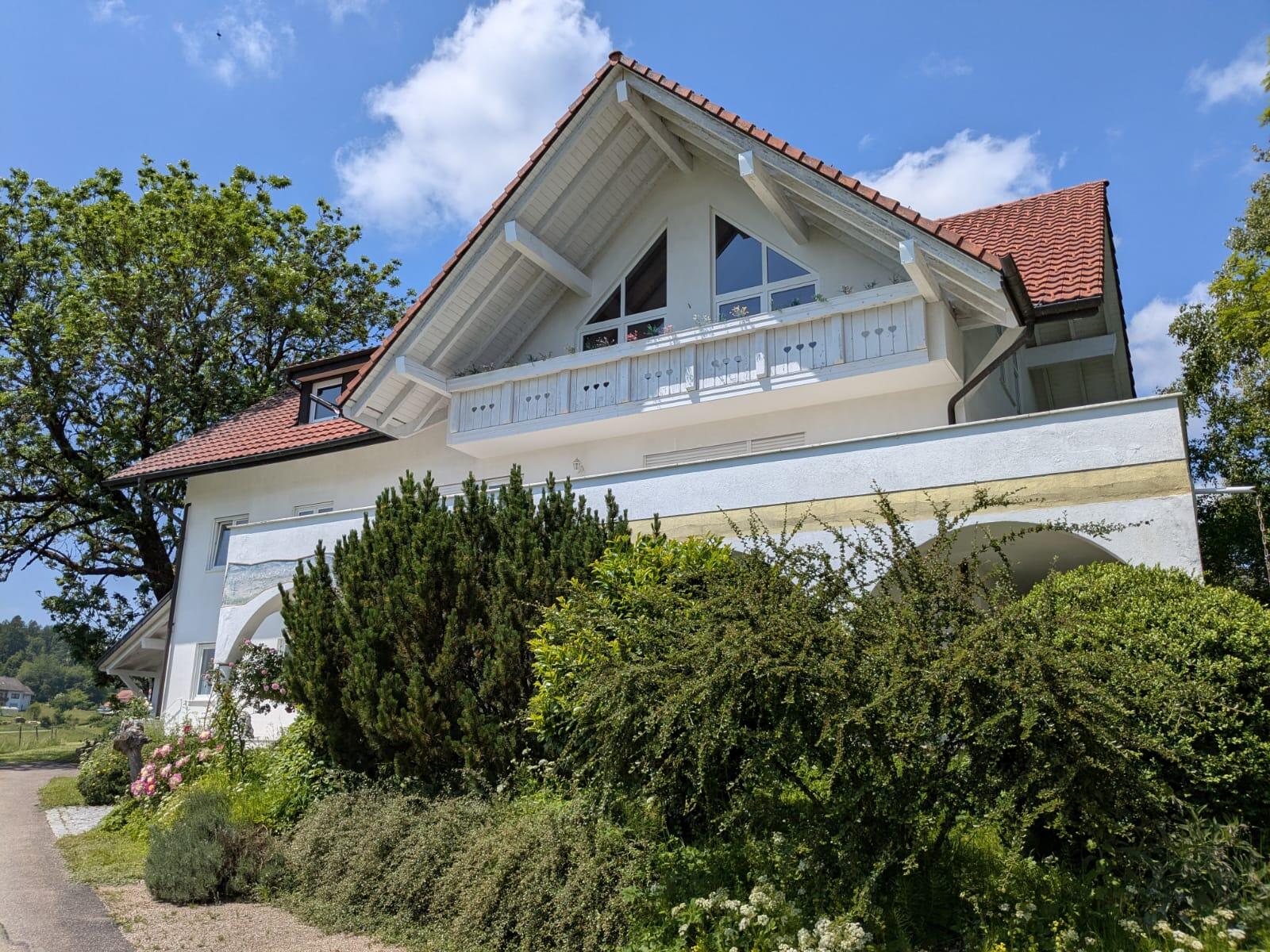 Die im mediterranen Stil gebauten Villa. Südwestseite; von der Loggia aus Blick ins Grüne und bei klarem Wetter schöner Fernblick auf das Schweizer Alpenpanorama.
