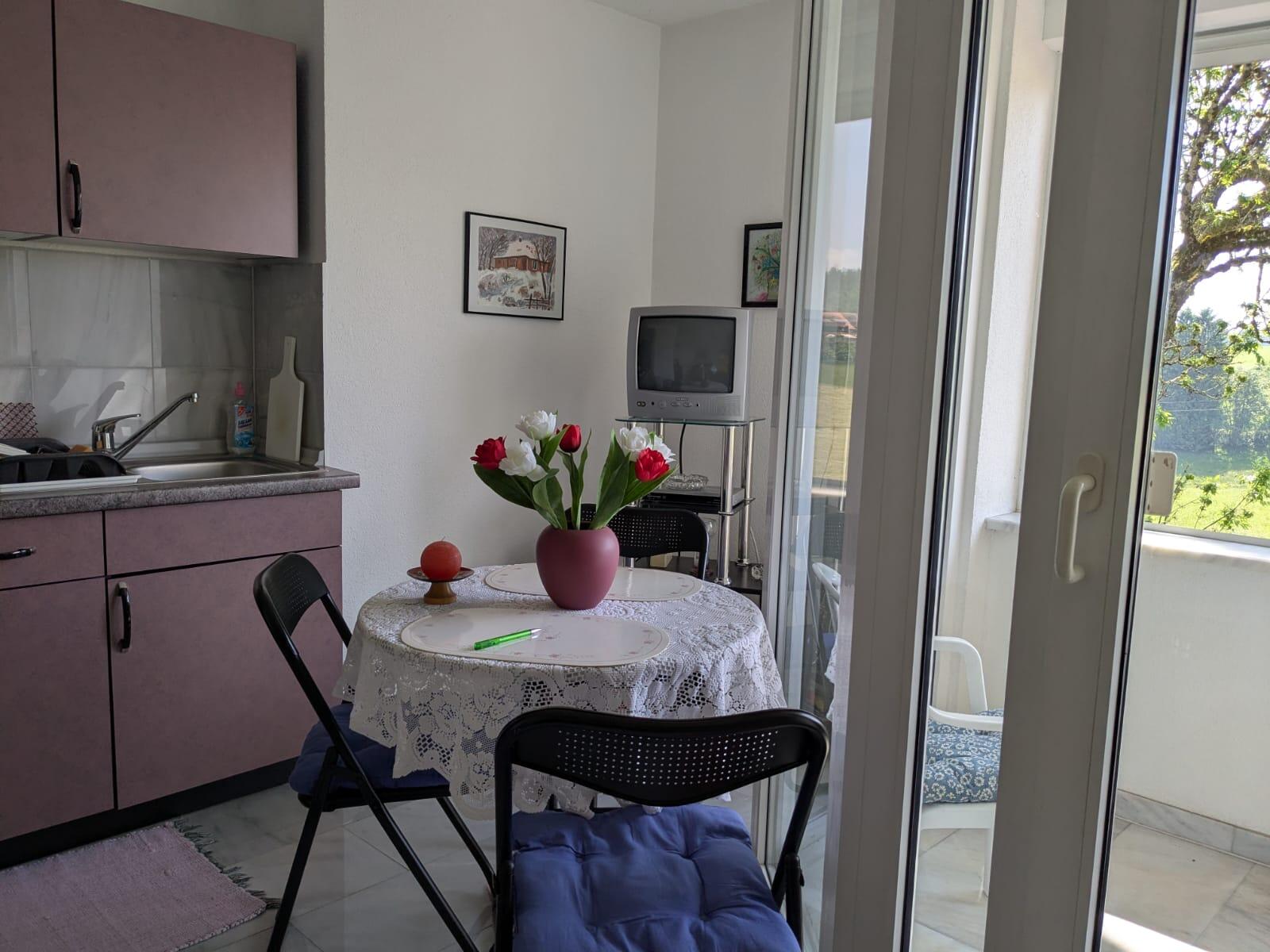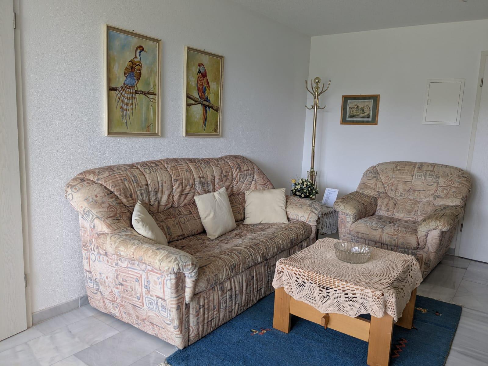 Das Wohnzimmer bietet eine gemütliche Atmosphäre mit Sitzgruppe (Couch ausziehbar), Esstisch, Einbauküche (komplett ausgestattet) und SAT-Fernsehen, sep. Schlafzimmer und Dusche/WC;