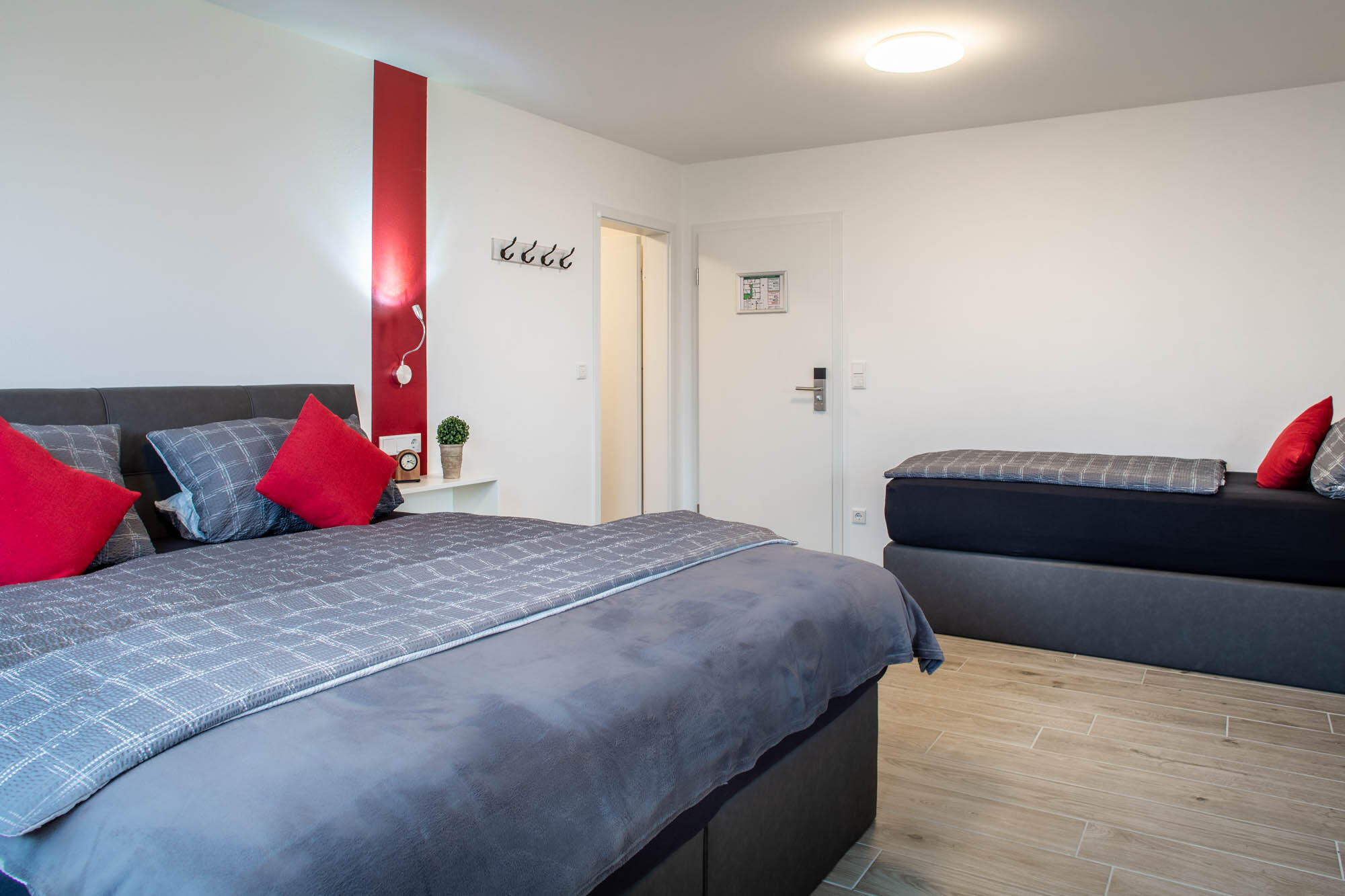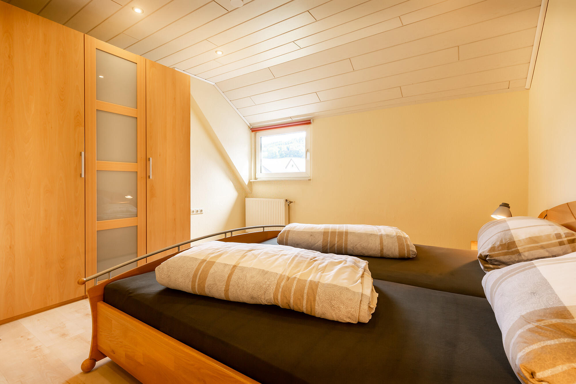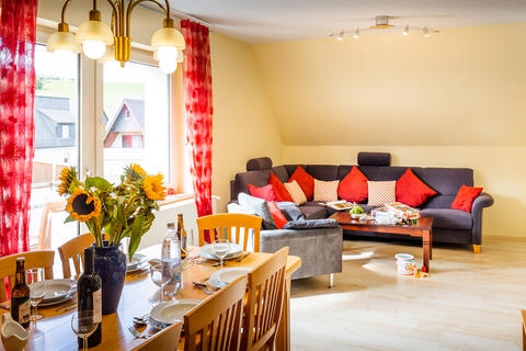 Im „Haus am Scheidt“, in einem ruhigen Wohngebiet, liegt die gemütliche Ferienwohnung für bis zu 9 Personen. An das geräumige Wohnzimmer in der Mitte mit dem großen Esstisch, grenzen die Küche und zwei separate Schlafbereiche. So kann die Wohnung auch gut von zwei Familien bewohnt werden. Ein Balkon sowie ein separater Bereich im Garten mit Trampolin, Grill und Gartenmöbeln, laden zu Mußestunden im Freien ein.