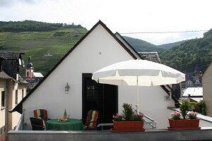 Die etwa 50 m² große Wohnung mit separatem Eingang liegt zentral aber ruhig nahe der Mosel direkt gegenüber der Altstadt von Zell, Die Innenstadt erreichen Sie zu Fuß als auch mit dem PKW in ein paar Minuten. Ein hauseigener Parkplatz sowie Fahrräder und eine Fahrradgarage sind vorhanden. Bei einer kleinen Weinprobe in unserem Weingarten der in wenigen Gehminuten zu erreichen ist, verraten wir Ihnen alles über unseren Wein. Die mit Terrassenmöbeln und Markise ausgestattete Sonnenterrasse bietet einen kleinen seitlichen Blick auf die Mosel und die Stadt auf der gegenüberliegenden Moselseite. Lassen Sie sich unsere edlen Tropfen aus der Lage der " Zeller Schwarze Katz" munden.