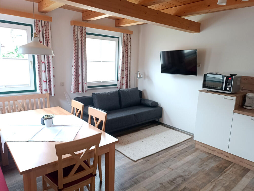 Das Appartement (ca. 60m²) besteht aus 2 Doppelbettzimmern mit je einem Zusatzbett für 4-6 Personen, Balkon, 1 Badezimmer, WC, Haarfön, 3x Fernseher, WIFI, Wohnküche komplett ausgestattet mit Geschirr, Geschirrspüler, Mikrowelle mit Grillfunktion, Wasserkocher, Tassimo Kaffeemaschine, Ceranfeld (2 Kochplatten); Bettwäsche und Handtücher sind vorhanden. Unser neues Appartement (ca. 60m²) wurde komplett renoviert (2018) und besteht aus 2 Doppelbettzimmern mit je einem Zusatzbett für 4-6 Personen, Balkon, 1 Badezimmer, WC, Haarfön, 3x Fernseher, WIFI, Wohnküche komplett ausgestattet mit Geschirr, Kühlschrank mit Gefrierfach, Tassimo Kaffeemaschine, Wasserkocher, Toaster, Geschirrspüler, Mikrowelle, Ceranfeld, Backofen, Couch (ausziehbar), Bettwäsche und Handtücher sind vorhanden. Außerdem bieten wir einen beheizten Schuhraum sowie einen Schistall.