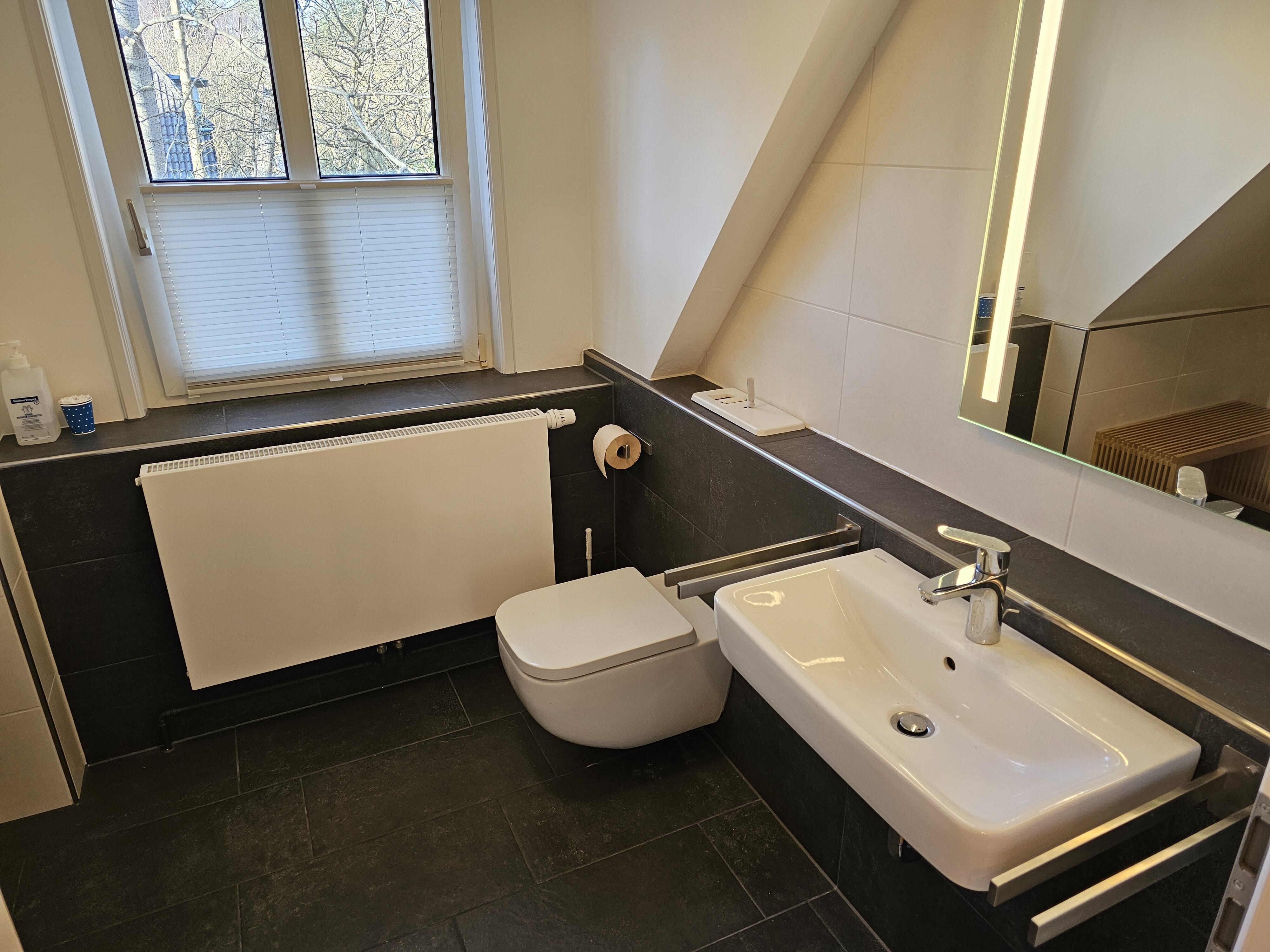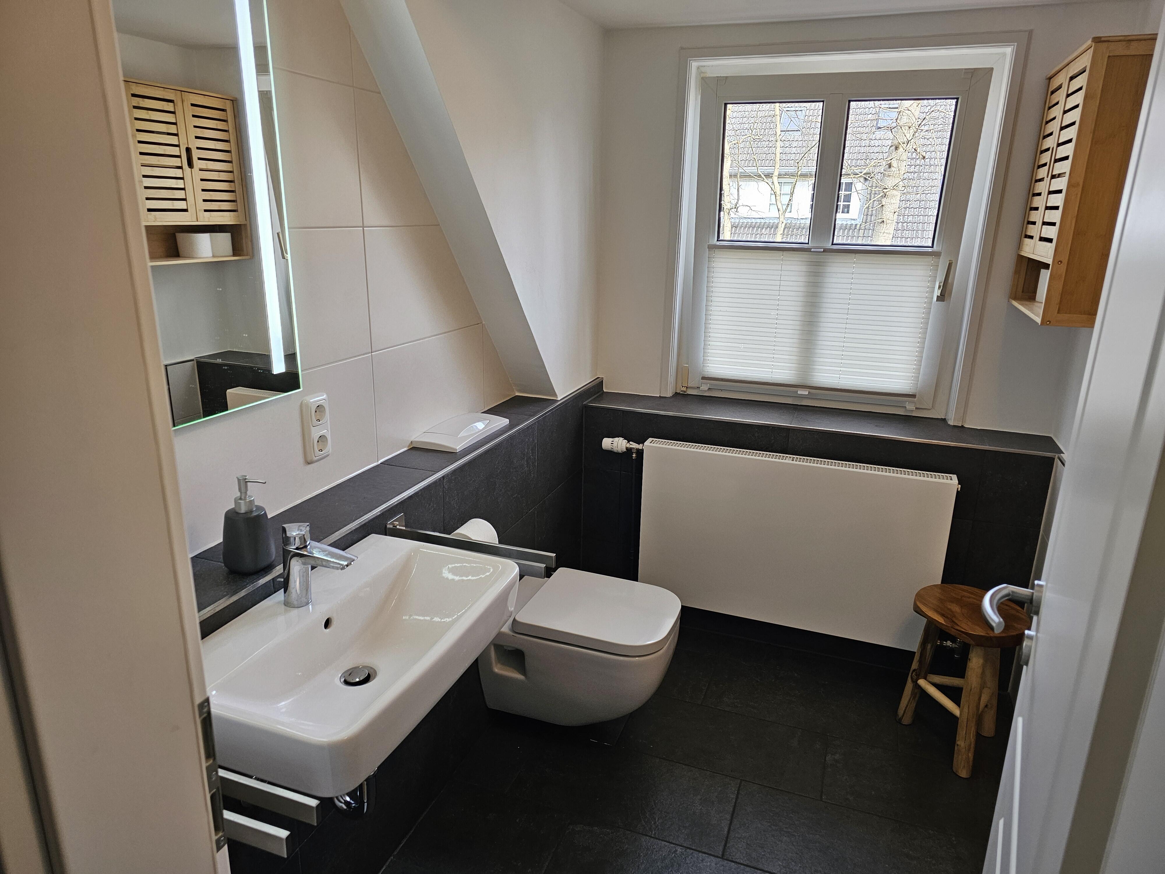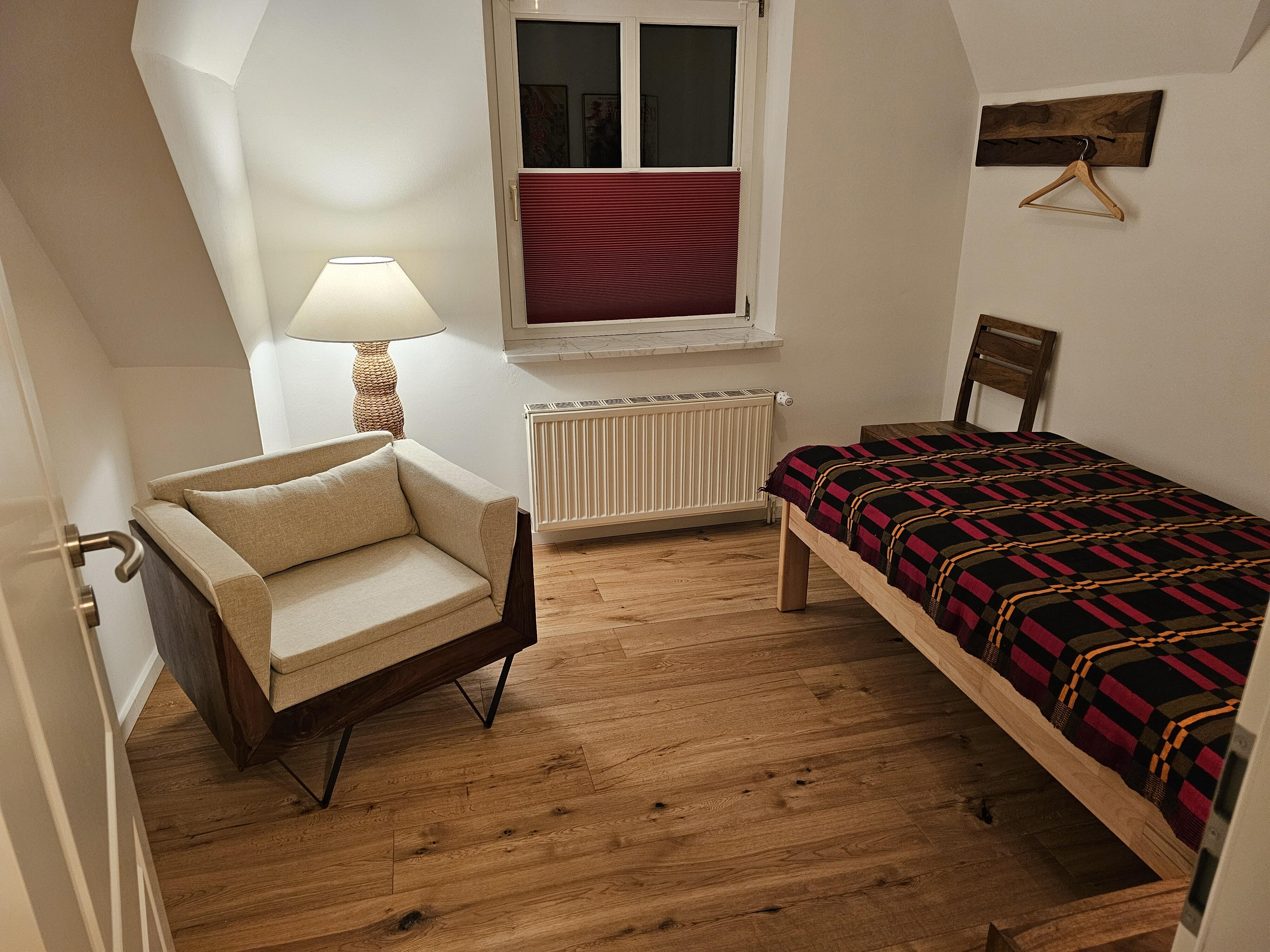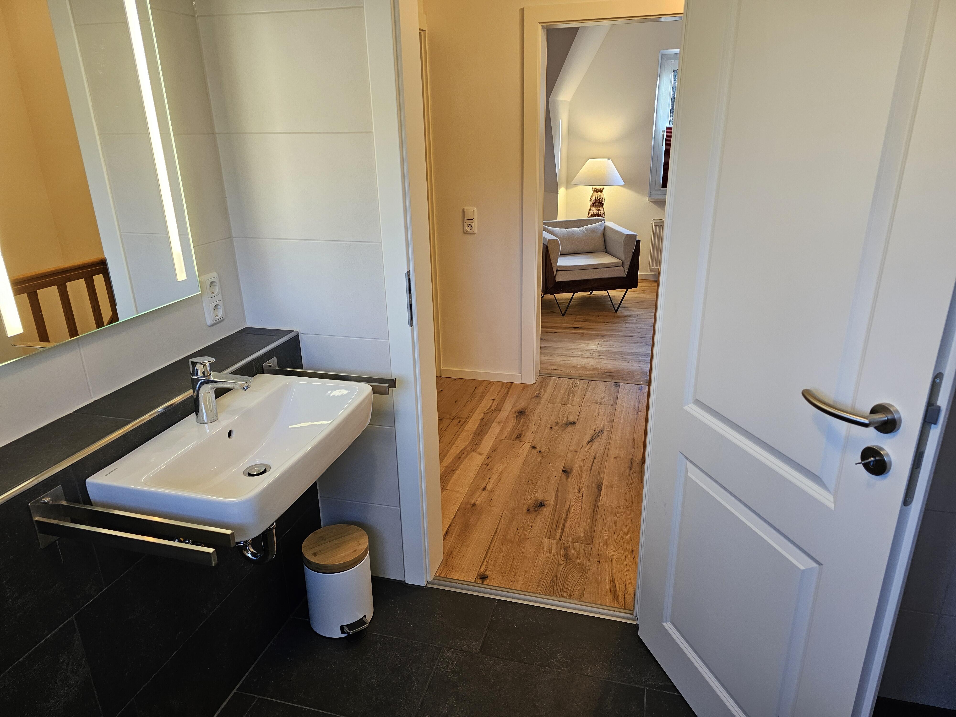 AUSSTATTUNG: Das Haus verfügt über zwei nahezu identisch geschnittene, jeweils knapp 80 qm große Ferienwohnungen, beide mit elegant designtem, hochwertigem Interieur. Wohnung 1 kann von bis zu fünf Erwachsenen genutzt werden. Hier gibt es im Obergeschoß drei Schlafzimmer mit Parkettböden, eines mit Doppelbett, eines mit zwei Einzelbetten und unser „Gaubenzimmer“ mit Blick auf die Frontterasse des Hauses; letzteres ist mit einem Einzelbett und einem Lesesessel bestückt. Im Bedarfsfall läßt sich in diesem Zimmer auch noch ein Klappbett platziern, so das gelegentlich auch einmal 6 Personen die Wohnung nutzen können.