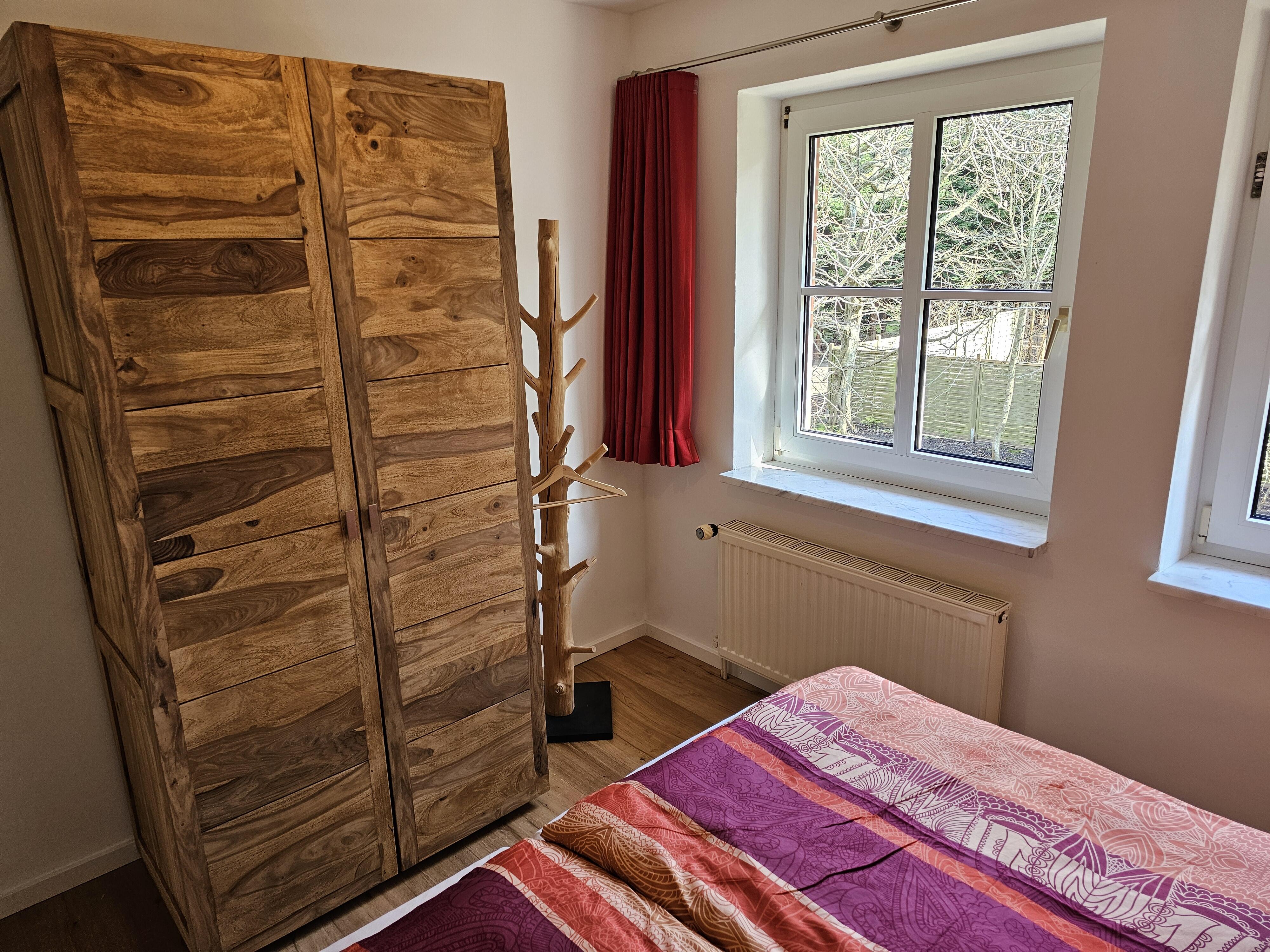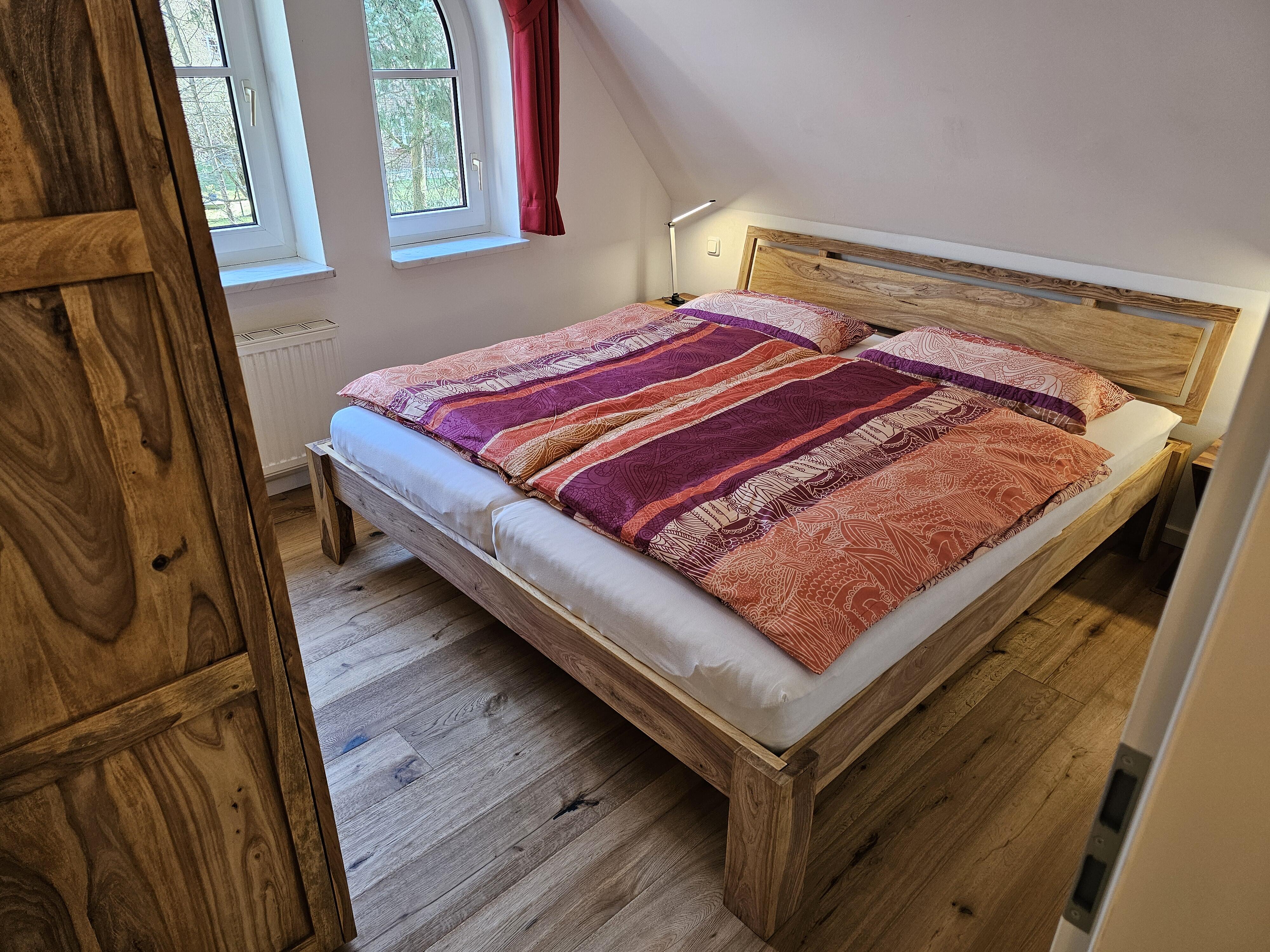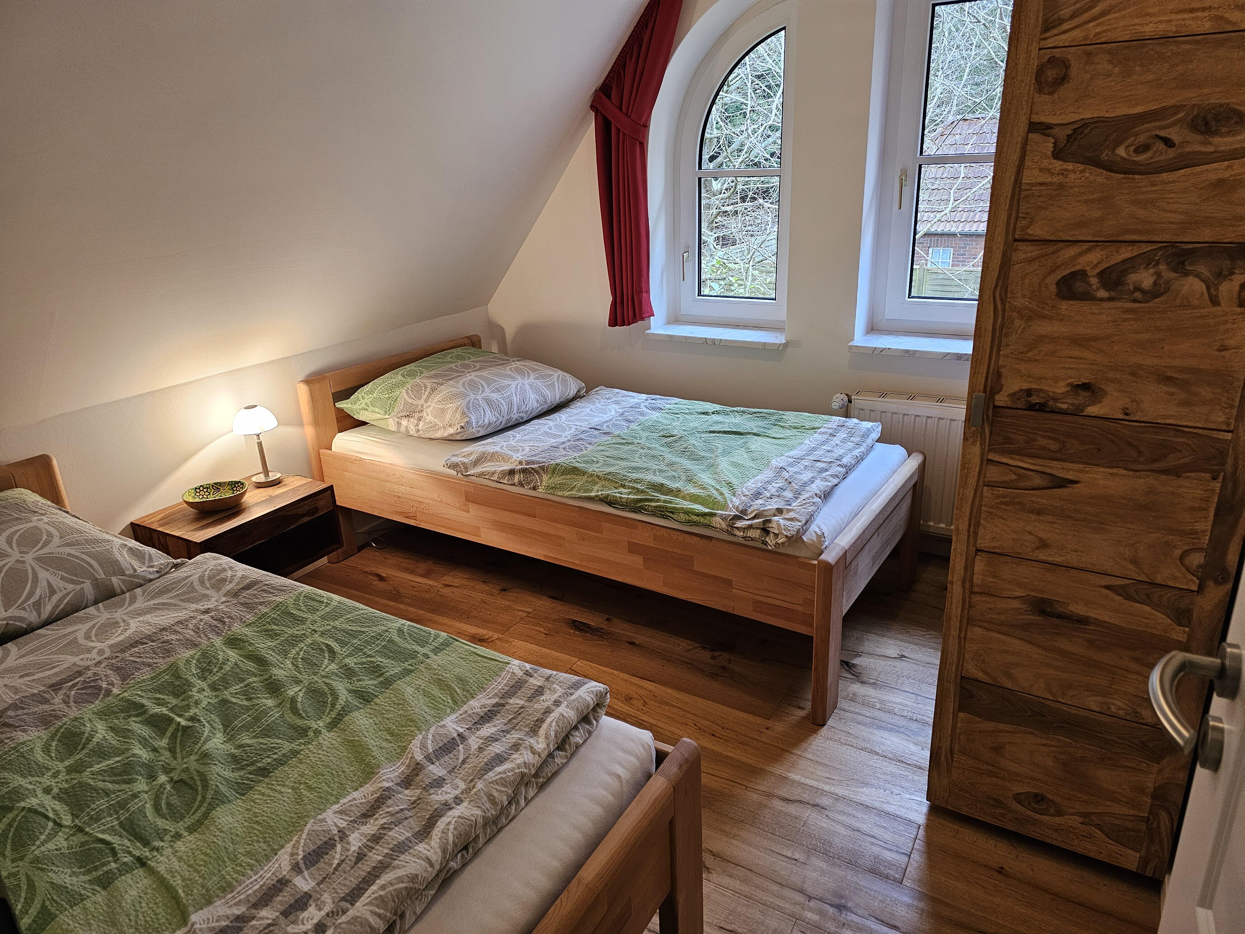 In der zweiten Wohneinheit befinden sich zwei mit hellen Teppichen ausgelegte Schlafräume, einer mit Doppelbett und einem kleinen Sekretär, der andere mit zwei Einzelbetten. All unsere Betten sind 2 Meter lang und mit Qualitätsmatratzen ausgestattet.