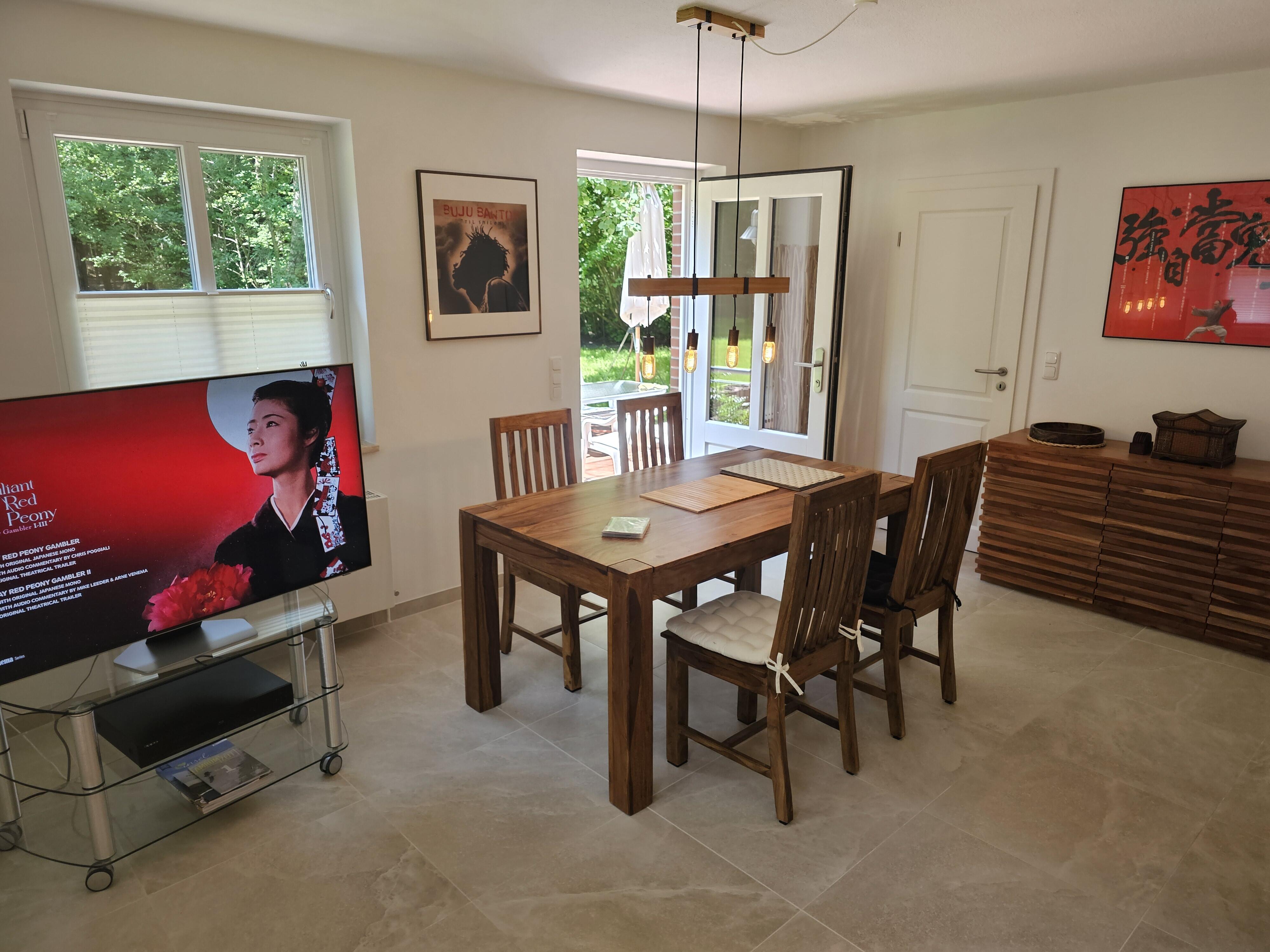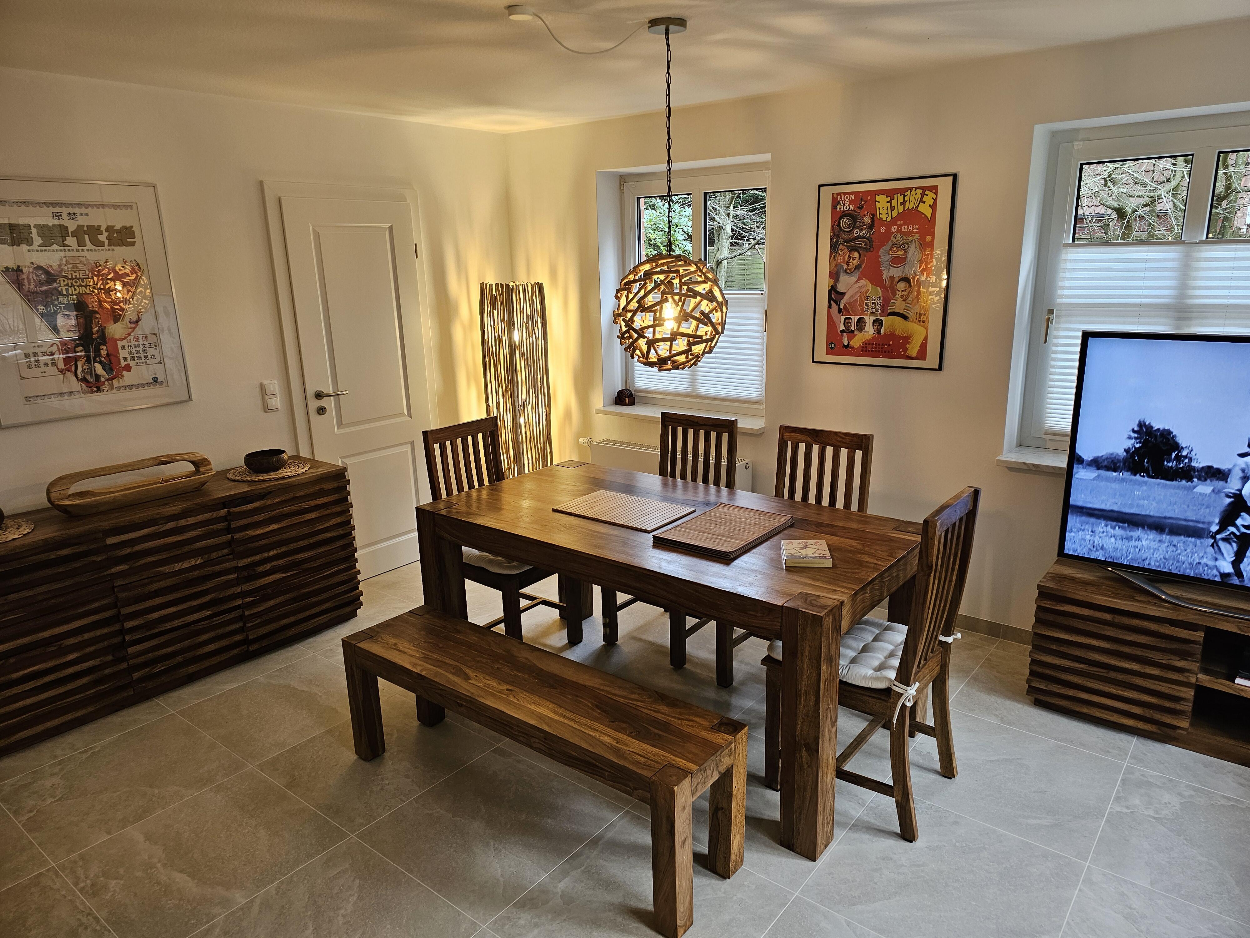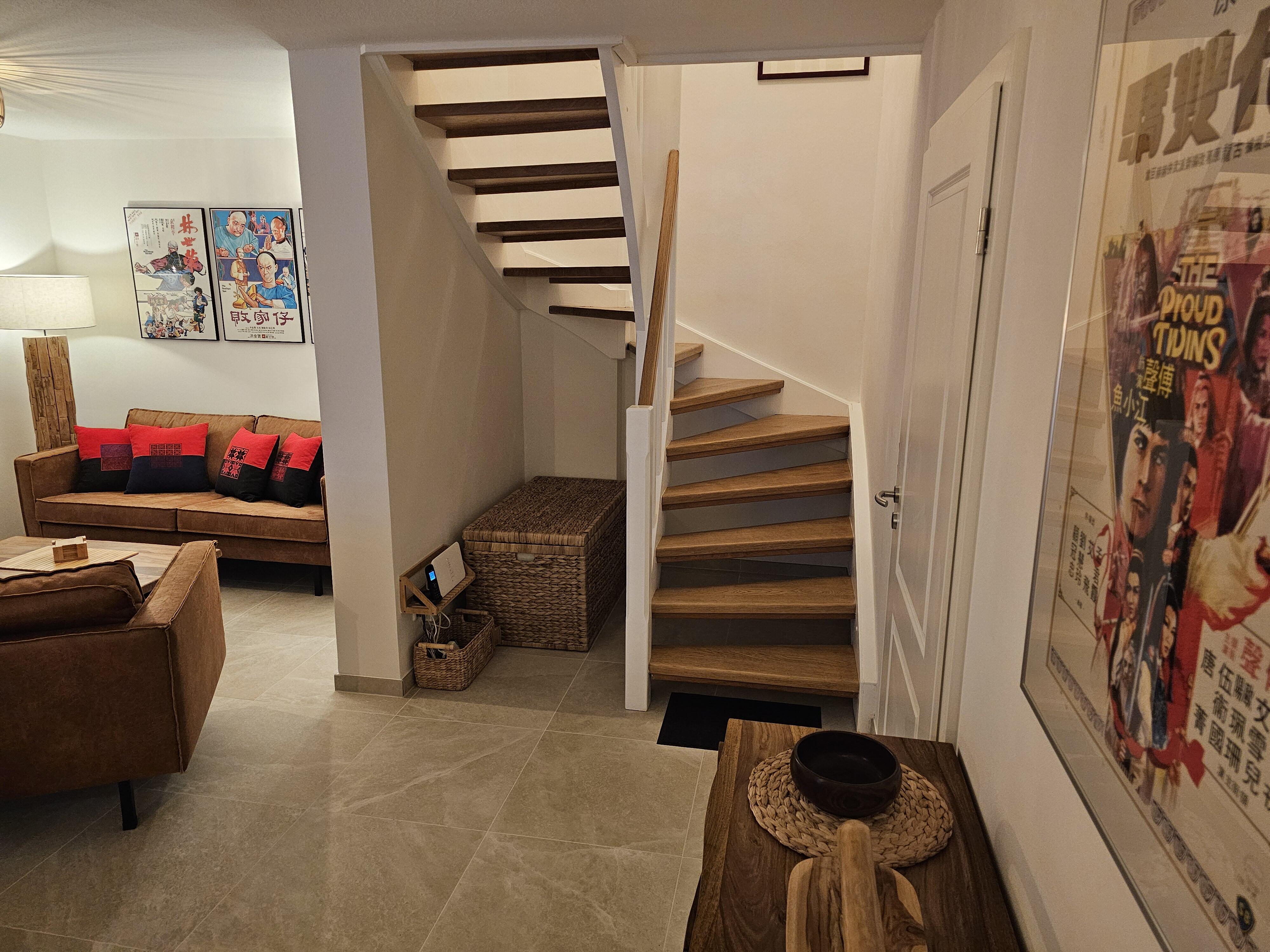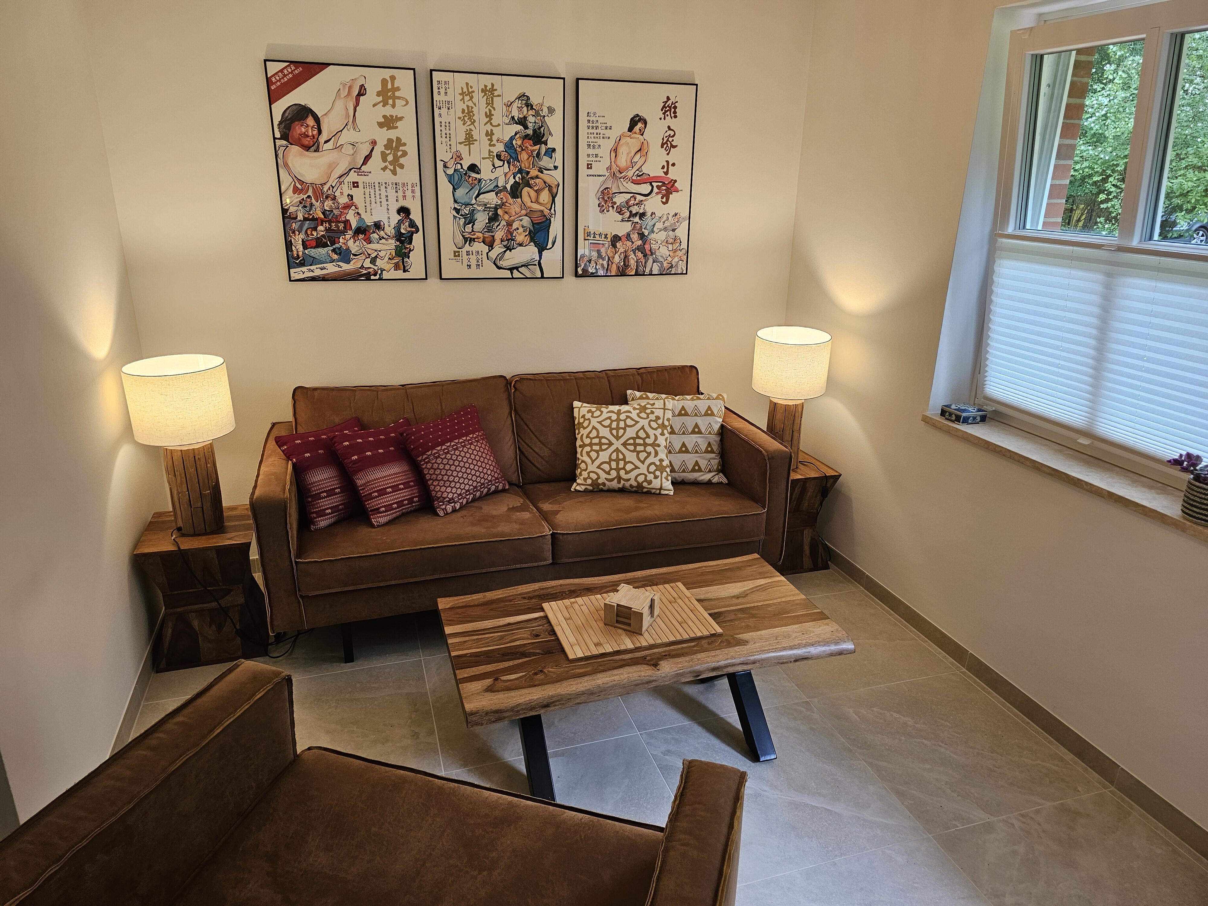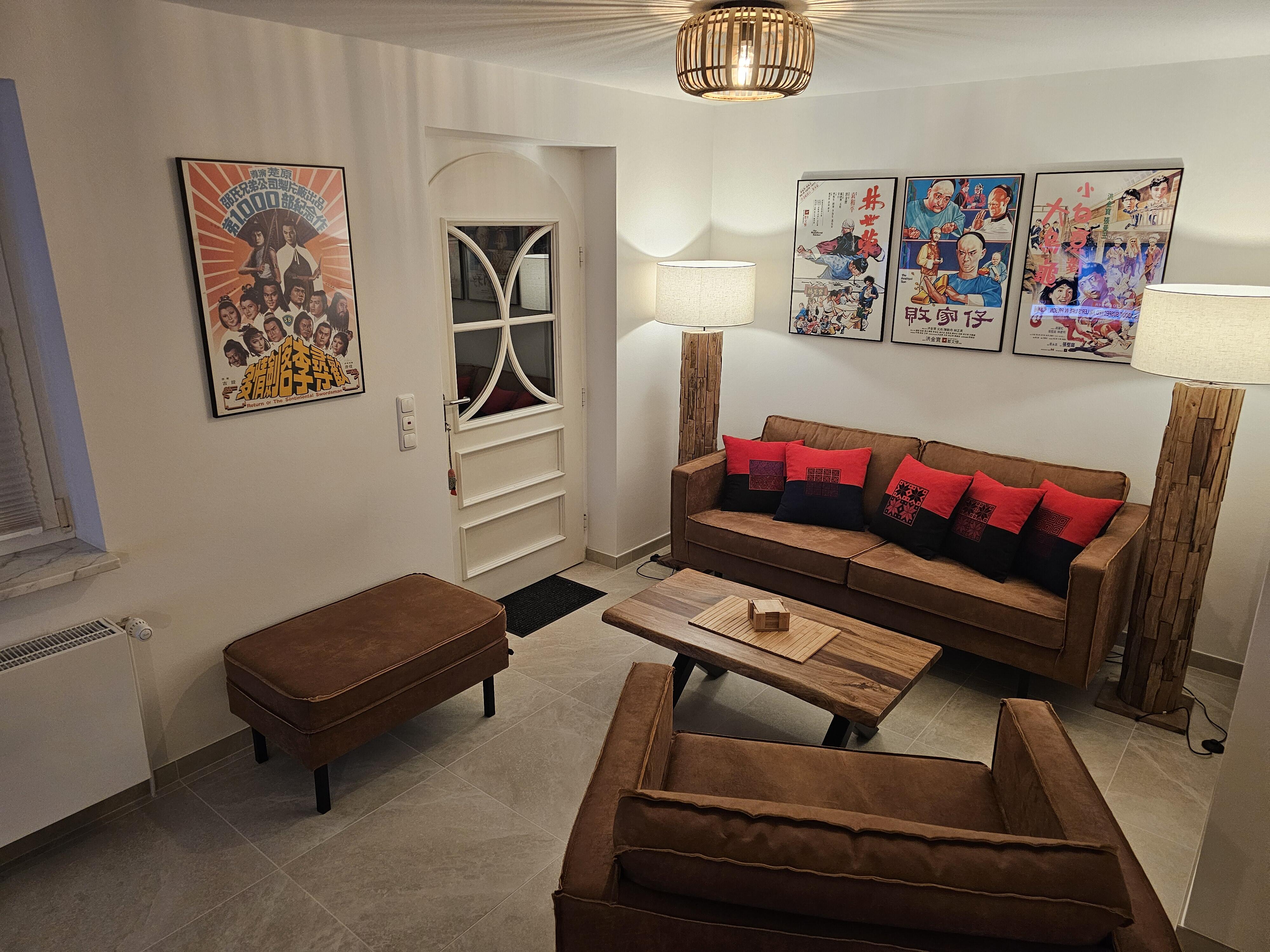 Das Erdgeschoß beider Wohnungen ist mit sandfarbenen italienischen Bodenplatten gefliest. Hier finden Sie einen großen Wohn-/Essraum, eingerichtet mit schweren Tropenholz-Möbeln und Stehleuchten und eine Sitzecke mit komfortabler Ledercouch und großem Sessel. Die Wände sind dekoriert mit klassischen kantonesischen Film-Art-Postern, die der ganzen Raumausstattung einen asiatischen Flair verleihen. In der großen Wohnung verfügen Sie über einen 65 Inch Großbild-TV, in der kleineren Wohneinheit über einen 55 Inch TV. In beiden Wohnungen finden Sie neue, voll ausgestattete Einbauküchen mit Granitcounter, Geschirrspülmaschine, Elektroherd mit Backofen, Elektrogeräten und reichlich Geschirr vor, sowie, im Eingangsbereich, eine Garderobe und ein kleines WC. Beide Wohnungen verfügen über W-Lan. Im Keller gibt es eine Waschmaschine, einen Trockner, sowie Bügelbrett und Bügeleisen. Ebenfalls im Keller untergebracht ist eine finnische Sauna.