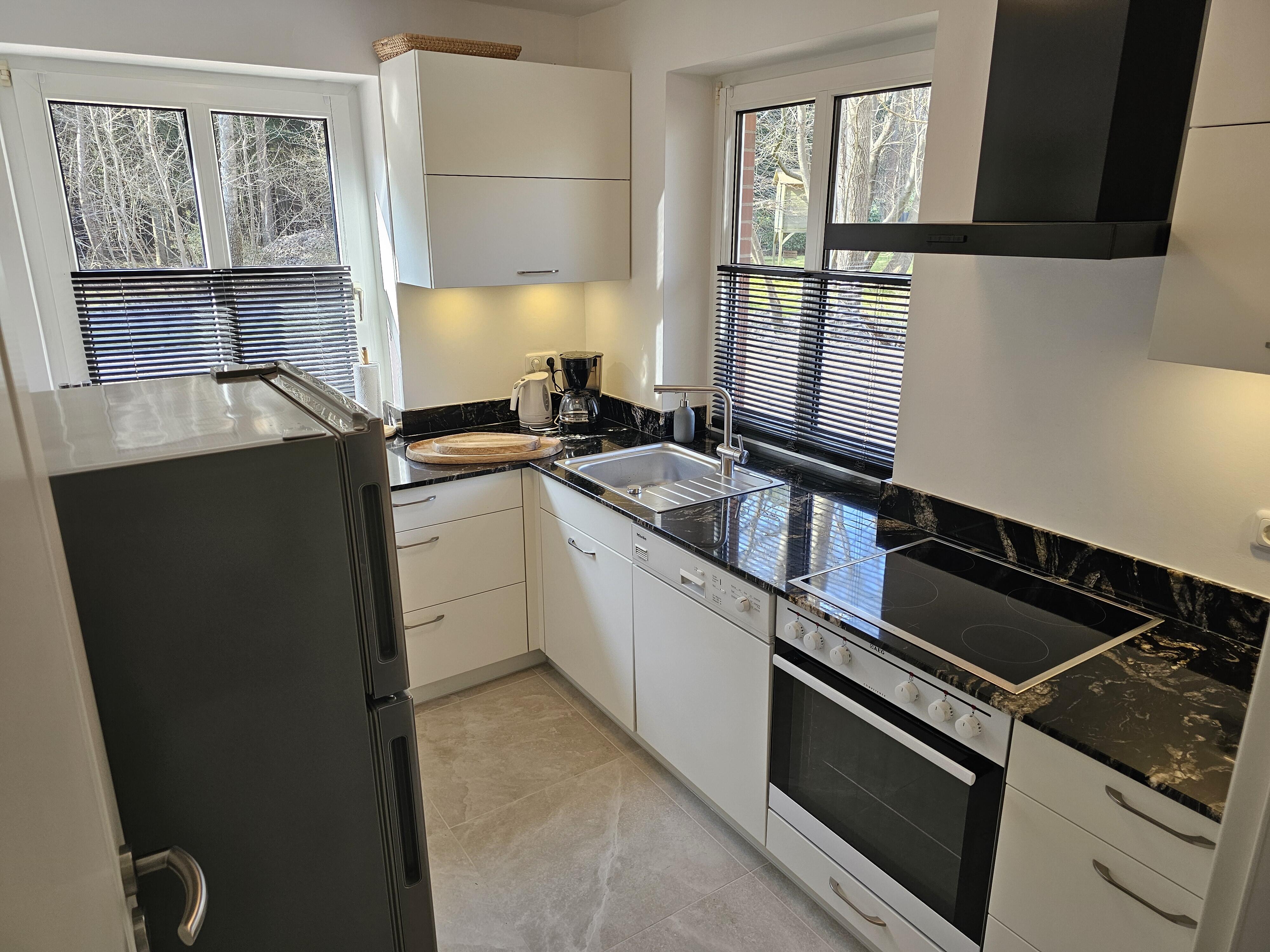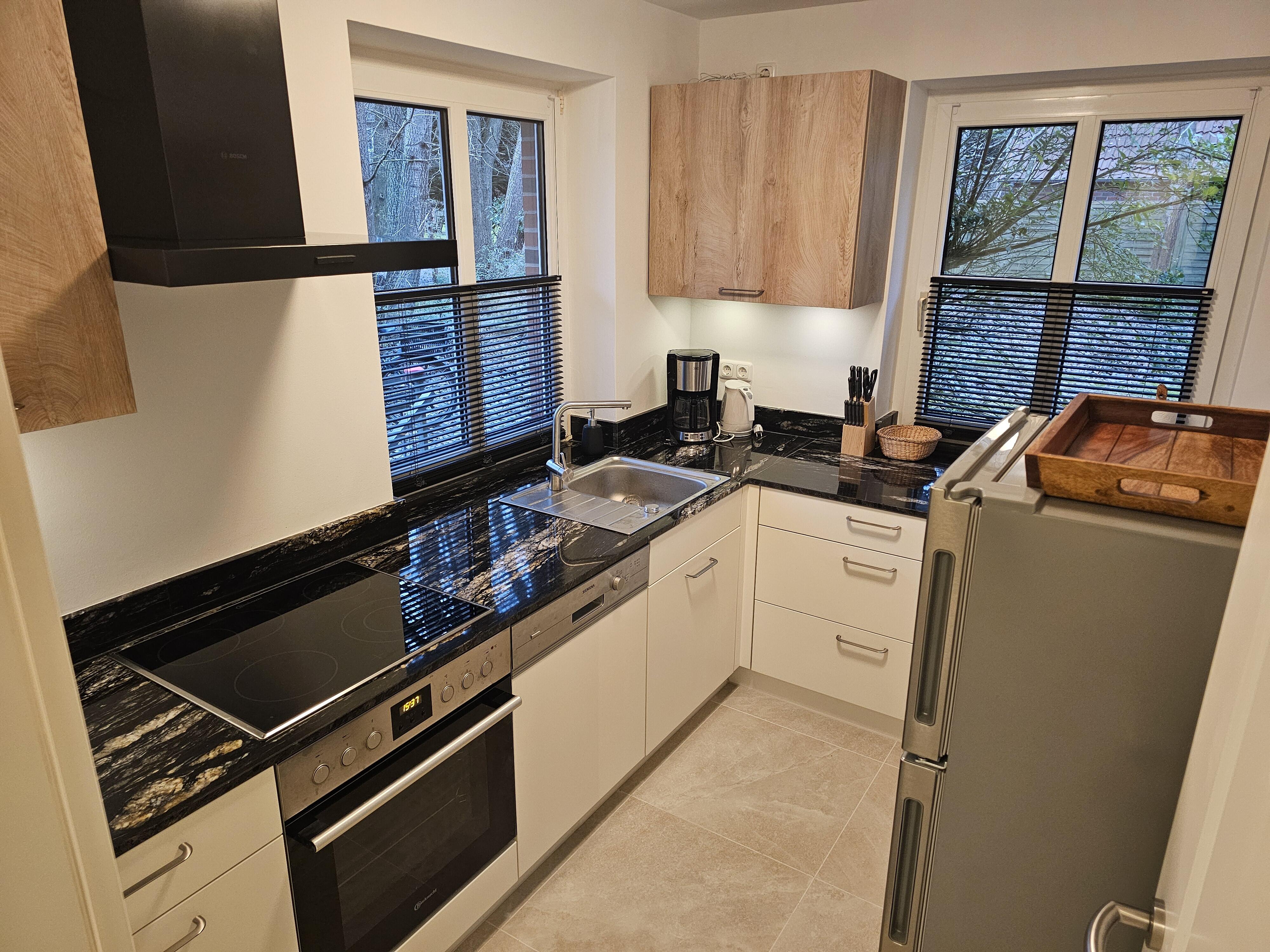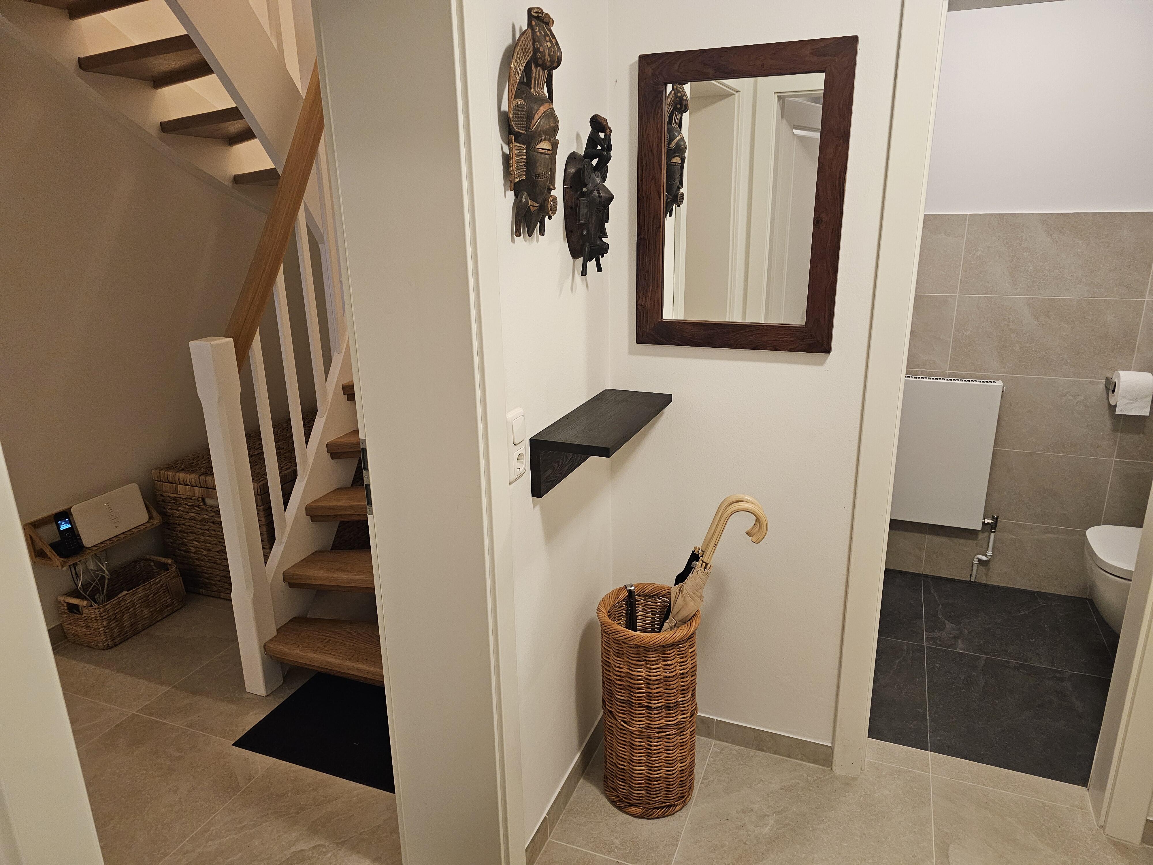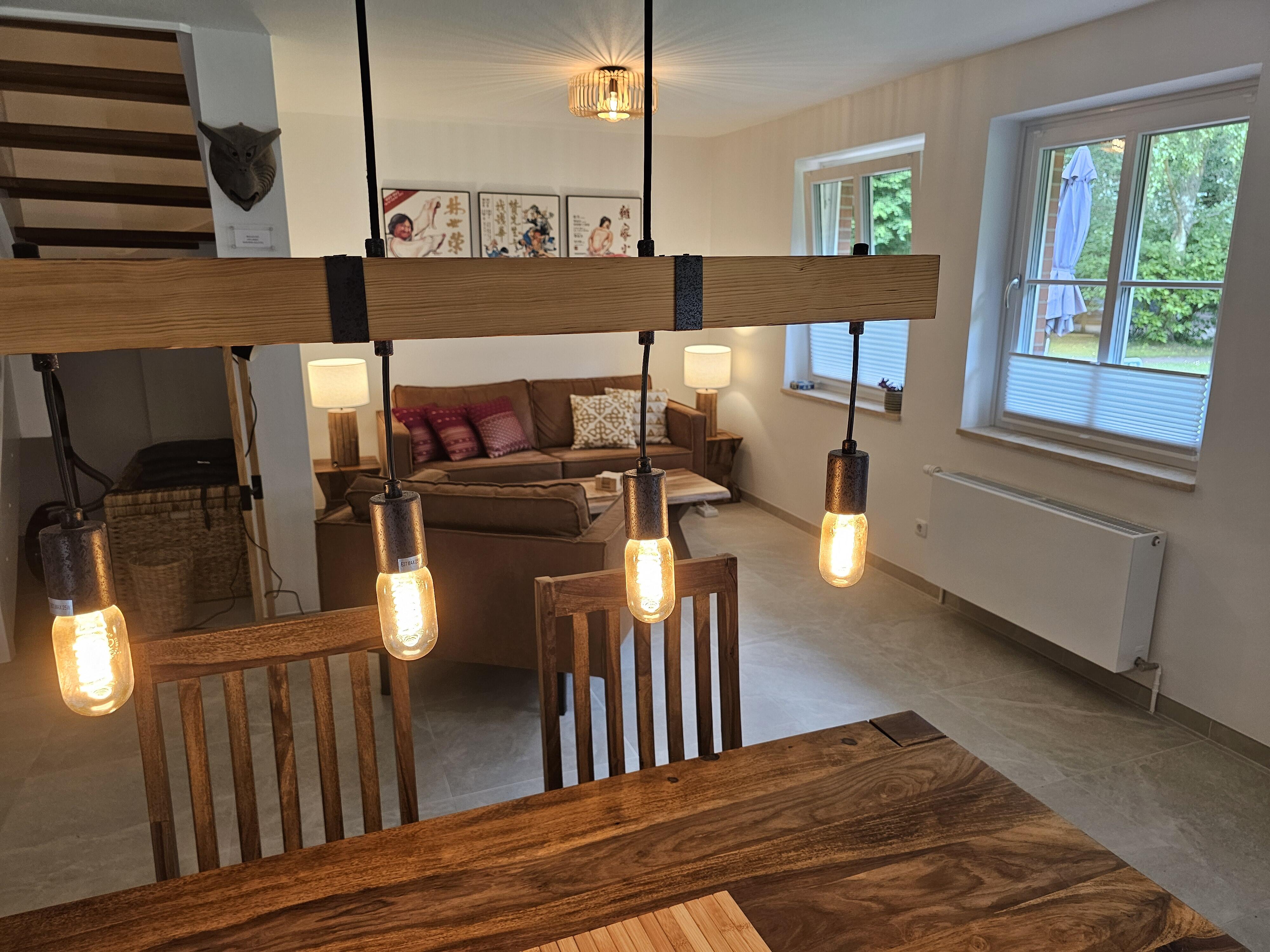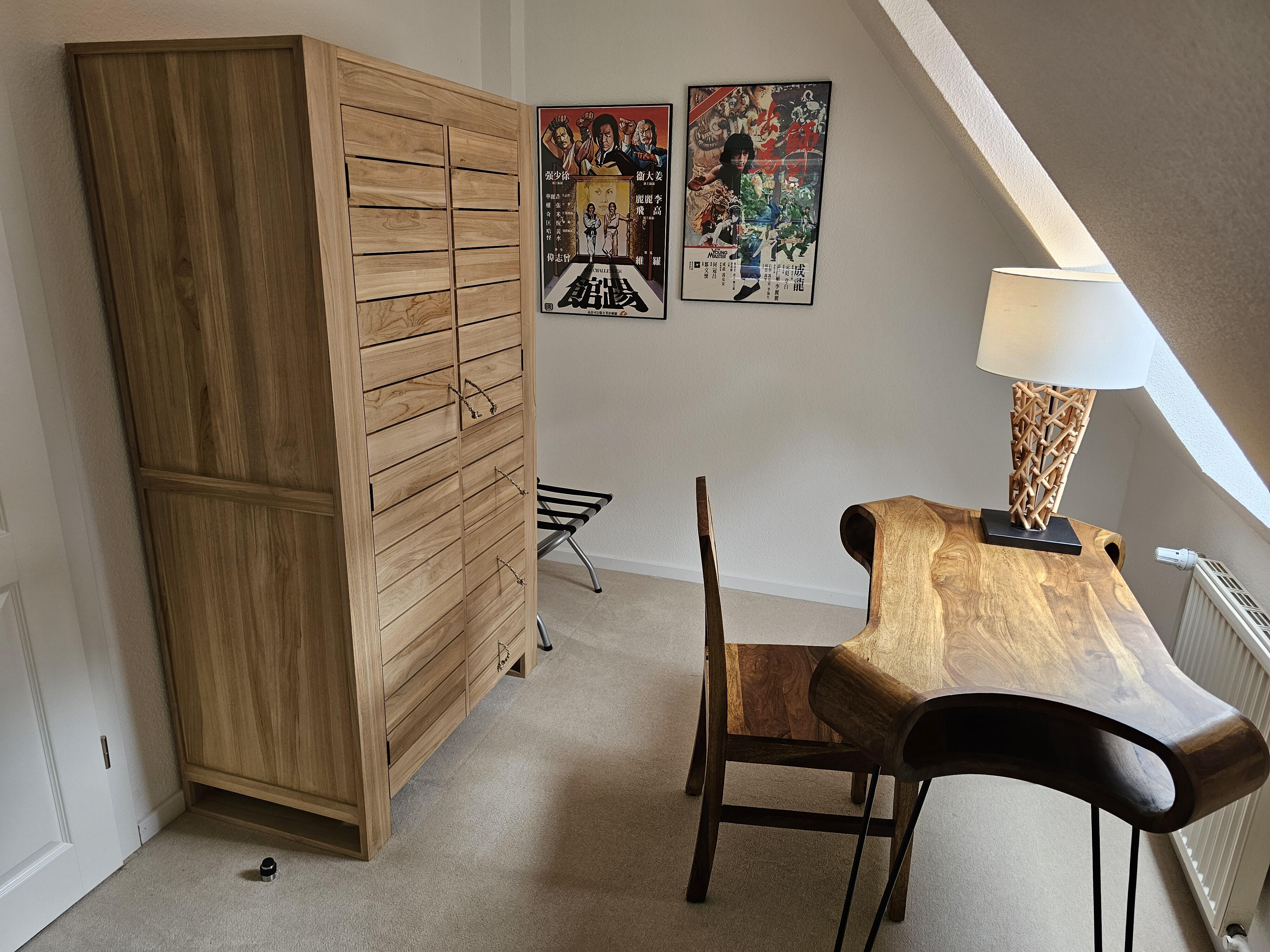 Das Erdgeschoß beider Wohnungen ist mit sandfarbenen italienischen Bodenplatten gefliest. Hier finden Sie einen großen Wohn-/Essraum, eingerichtet mit schweren Tropenholz-Möbeln und Stehleuchten und eine Sitzecke mit komfortabler Ledercouch und großem Sessel. Die Wände sind dekoriert mit klassischen kantonesischen Film-Art-Postern, die der ganzen Raumausstattung einen asiatischen Flair verleihen. In der großen Wohnung verfügen Sie über einen 65 Inch Großbild-TV, in der kleineren Wohneinheit über einen 55 Inch TV. In beiden Wohnungen finden Sie neue, voll ausgestattete Einbauküchen mit Granitcounter, Geschirrspülmaschine, Elektroherd mit Backofen, Elektrogeräten und reichlich Geschirr vor, sowie, im Eingangsbereich, eine Garderobe und ein kleines WC. Beide Wohnungen verfügen über W-Lan. Im Keller gibt es eine Waschmaschine, einen Trockner, sowie Bügelbrett und Bügeleisen. Ebenfalls im Keller untergebracht ist eine finnische Sauna.