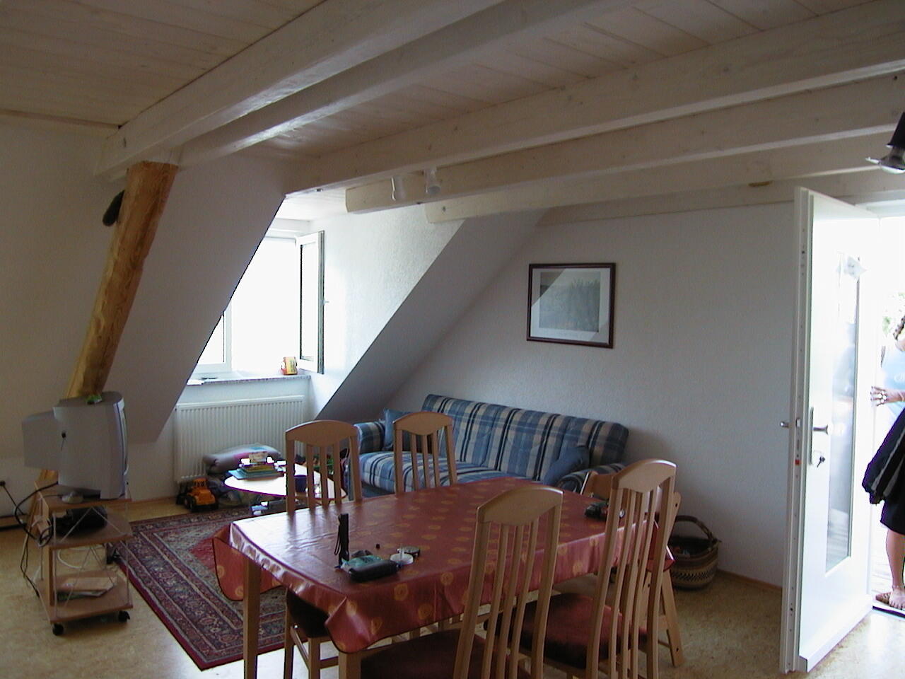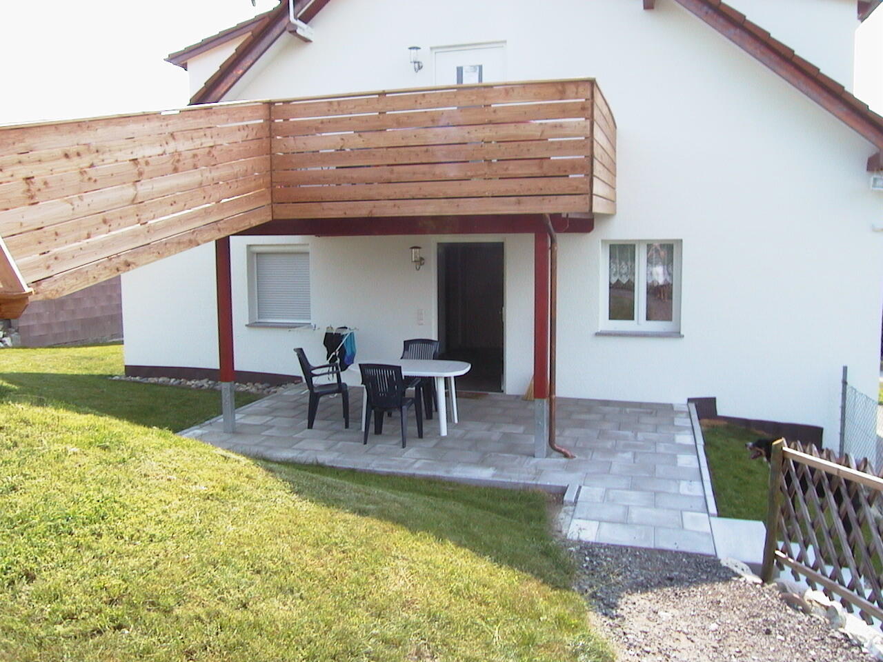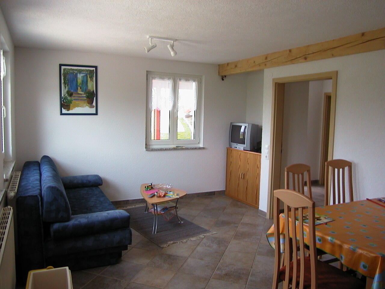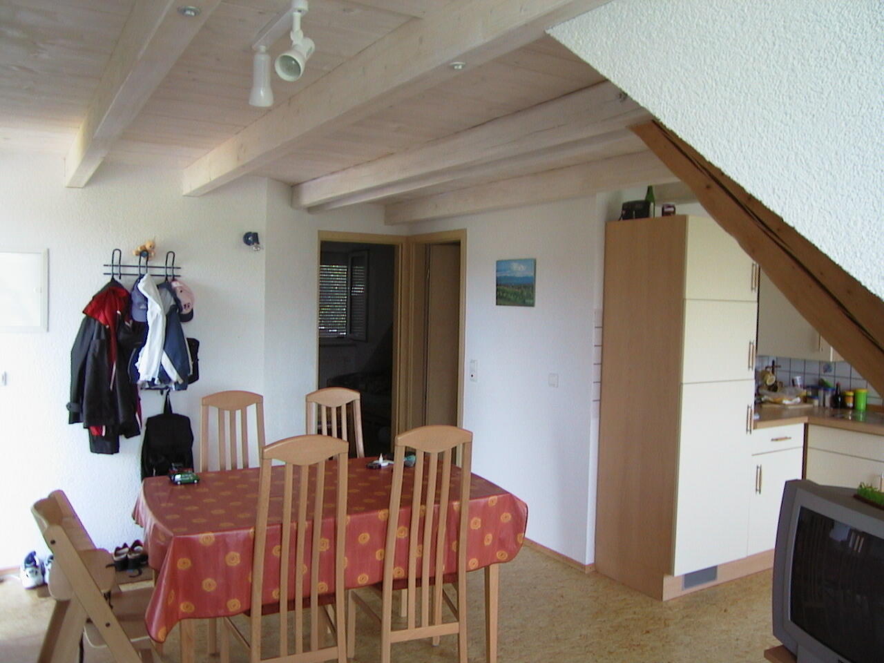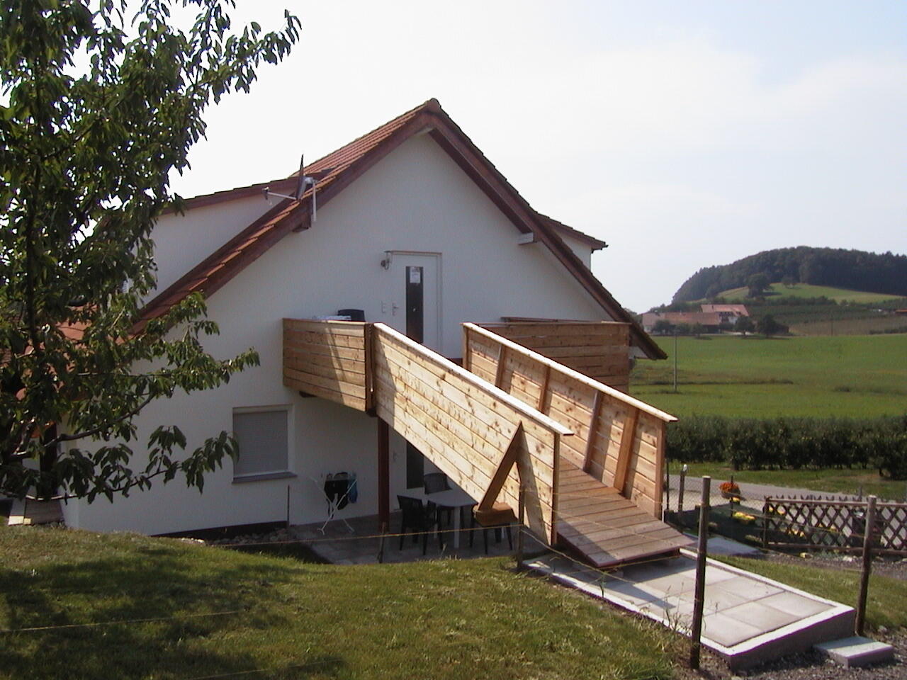 ( 2 Wohnungen für 6 Personen mit Terrasse, 1 DG-Wohnung für 4 Personen ohne Balkon) an. Sie genießen einen schönen Blick von der Terrasse auf die Obst - und Wiesenlandschaft. Wir bieten Ihnen 2 und 3 Zimmer Ferienwohnungen ( 1 davon ist behindertengerecht) mit je einem oder zwei getrennten Schlafzimmern. Eine Wohnung im DG ohne Balkon mit einem separaten Schlafzimmer. 2 Wohnungen mit Wohnküche incl. Wohnraum mit Kuschelsofa, Dusche/WC und einem schönen großen Balkon. Zudem ist eine Waschmaschine, SAT TV, Kinderbetten, Hochstühle, Wickelauflagen und Kinderbesteck vorhanden. Zusätzlich befindet sich eine große Liegewiese mit Grill, Parkplatz, Kinderspielplatz, Tischtennis, Spielraum mit Tischfußball und einem Fußballplatz auf unserem Hof. Tiere sind auf Anfrage erlaubt.