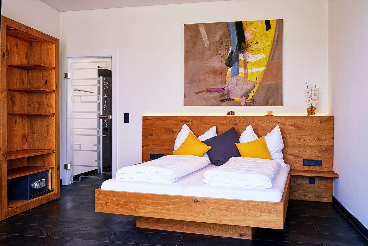 Unsere Gästezimmer: Ausgangspunkt für Genusstouren Hier finden Sie Raum zum Innehalten und genießen: Sei es eine persönlich geführte Weinverkostung, ein Spaziergang über die Weinberge, eine Wanderung durch unberührte Naturlandschaften oder kulinarische und kulturelle Spezialitäten. Fühlen Sie sich bei uns gut aufgehoben. Unsere zwei Gästezimmer sind einladend komponiert und mit modernster Technik (Flachbildfernseher, kostenloses WLAN, Safe - auch für breite Laptops etc., Schließsystem, Stromhauptschalter für von Elektrosmog geplagte ...) ausgestattet. Die Zimmer haben eine eigene Eingangstüre, sodass man beim "Nach Hause Kommen" niemanden stört. Am Morgen wird man - wenn man es will - von der direkt über der ungarischen Tiefebene aufgehenden Sonne geweckt und es erwartet Sie nach einer ruhigen, erholsamen Nacht ein reichhaltiges Frühstück mit regionalen und saisonalen Köstlichkeiten. Den Zeitpunkt dafür vereinbaren Sie einfach mit uns. Für Frühaufsteher, die eventuell den Sonnenaufgang bewundern wollen, gibt es eine Nespressso-Maschine in jedem Zimmer. Zusätzlich befindet sich in jedem Zimmer ein immer gut gefüllter Weinkühlschrank, sodass Sie gemütlich am Nachmittag oder in lauen Nächten auf unserem Stammtisch noch "nachverkosten" können.