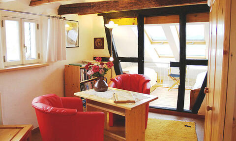 Zur ca. 67 qm großen Ferienwohnung für 1-4 Personen gehören ein Stellplatz, ein kleiner Bauerngarten und eine große Terrasse mit Terrassenmöbeln und Grill sowie ein Gartenhaus für die mitgebrachten Fahrräder unserer Gäste. Der separate Eingang liegt im historischen Stallanbau des Gebäudes, die Eingangstür ist eine „Klöntür“ bei der der obere Teil getrennt geöffnet werden kann.