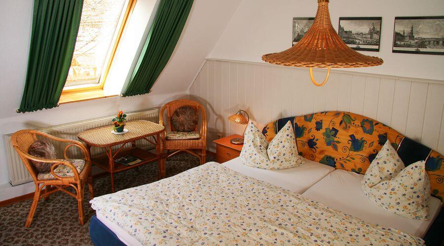 Alle 3 Einzelzimmer liegen in der 1.Etage und sind mit DU/WC, TV und einem Schreibtisch ausgestattet. Wenn es die Belegung zuläßt, sind natürlich auch die Doppelzimmer im Erdgeschoss einzeln buchbar. Einige der Einzelzimmer können wir mit einem Zusatzbett zum Doppelzimmer umbauen. Wir verfügen über 6 Doppelzimmer im Erdgeschoss, sowie 3 Doppelzimmer in der 1. Etage. Alle Zimmer sind mit DU/WC und TV ausgestattet. In einigen Zimmern können wir die Betten je nach Wunsch getrennt oder zusammen stellen. Eine Aufbettung ist in fast allen Zimmern möglich, ein Babybett ist vorhanden. 2 Dreibettzimmer Unser großes Dreibettzimmer (ca. 35m²) mit herrlichem Blick bis ins Elbsandsteingebirge, ausgestattet mit DU/WC und Fernseher liegt am südlichen Giebel in der 1. Etage. Eine Aufbettung für die 4. Person ist möglich.