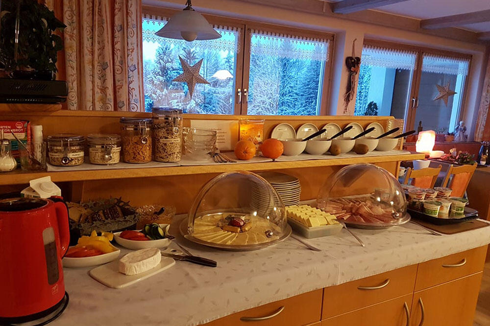 Lassen Sie die Seele baumeln in der Pension Bodenmais Haus Sonnenfels! Buchen Sie eines der schönen Zimmer oder Ferienwohnungen in unserem Haus mit Panoramablick und lassen Sie sich in unserer Pension Bodenmais im Bayerischen Wald verwöhnen, damit auch Sie dieses wunderbare Gefühl der Erholung hoch oben verspüren können: Ich habe geschlafen wie ein Murmeltier. Noch einmal umdrehen, fünf Minuten nur. Verlockend: Kaffeeduft, frische Semmeln. Na gut, zwei Kniebeugen, einmal strecken am Balkon, Vogelgezwitscher, der Geruch von frischem Gras. Diese herrliche Aussicht auf die Bayerwaldberge. Es ist wie heimkommen. Wie ein Versprechen, Mmmh, Frühstück. Lachende Gesichter ringsum, freundliches "Guten Morgen". Bitte Platz nehmen, zugreifen und verwöhnen lassen. Gönnen Sie sich ein bißchen mehr Vergnügen. Entfliehen Sie Ihrem täglichen Alltagsstress bei behaglichem Wohnen und viel Ruhe in frischer Luft, ganz oben auf dem Berg. Sie machen Urlaub am Waldrand in sonniger und sehr ruhiger Lage. Von Ihrem Zimmer in der Pension Bodenmais aus haben Sie einen herrlichen Blick auf Bodenmais und die bewaldeten Höhen des schönen Bayerischen Waldes. Ortsmitte und Kurzentrum sind in 15 Min. zu Fuß erreichbar. Wir möchten, daß Sie sich sehr wohl bei uns fühlen. Sie sind herzlich willkommen. Die großzügig angelegte Terrasse, Liegewiese sowie Kneippbecken mit eigenem Quellwasser in der Pension Bodenmais stehen Ihnen bei uns zur Verfügung. Aufenthaltsraum, gekühlte Getränke und Gästekühlschrank im Haus.