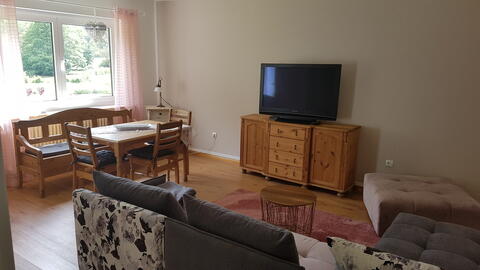 Unsere Ferienwohnung (70 qm) in der Pulgersmühle Wohnbereich mit Essplatz, SAT TV Offene Küche Wintergarten mit angrenzendem Balkon Blick auf unsere Teichanlage und ins herrliche Flaumbachtal Großzügiges Schlafzimmer Renoviertes Bad mit Regenwalddusche WLAN free FRAGEN SIE NACH ANGEBOTEN IN DER NEBENSAISON