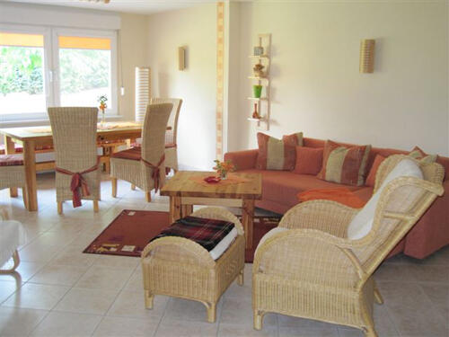 Unsere Ferienwohnung ist genau genommen ein freistehender Ferienbungalow auf unserem Grundstück. Er wurde 2006 renoviert und komplett neu ausgestattet. Der Bungalow ist sehr geräumig, funktionell eingerichtet und liegt mitten im Grünen. Für bis zu 5 Personen bietet er Platz in 2 Doppel-Schlafzimmern. In der voll ausgestatteten Küche finden Sie u.a. Kaffeemaschine, Herd, Backofen, Mikrowelle, Kühlschrank, Spülmaschine usw. Das Bad bietet Ihnen WC, Dusche und eine Badewanne. Unser Ferienobjekt verfügt über eine separate Zufahrt sowie Parkmöglichkeiten unmittelbar neben dem Bungalow. Da wir unseren Gästen stets einen sauberen und angenehmen Aufenthalt bieten möchten, wird im Haus nicht geraucht und Haustiere sind nicht gestattet. Das gesamte Objekt ist sehr gepflegt und wir freuen uns über Gäste, die das genießen möchten.