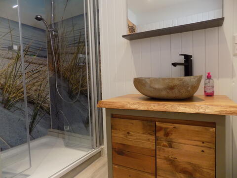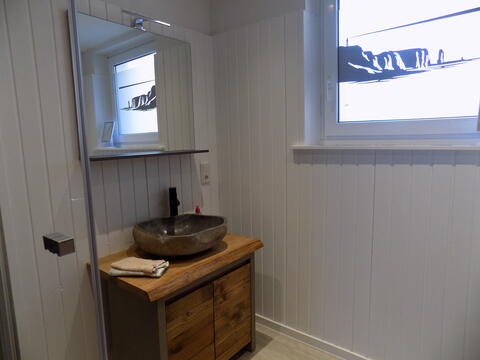 Badezimmer: Dusche, Handtücher, Badetücher, Fön, Kosmetikspiegel