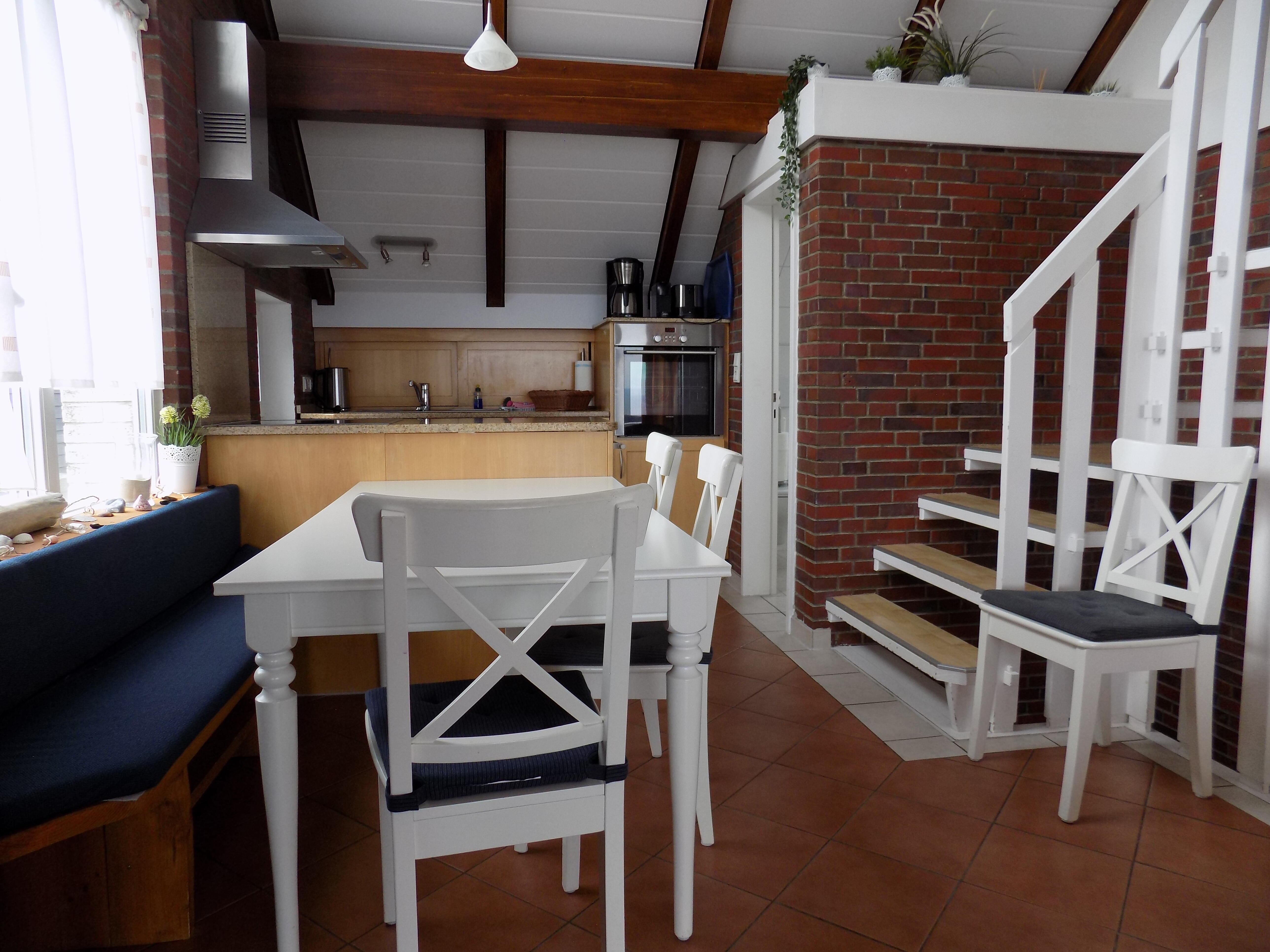 • über 2 Stufen Übergang zum Küchenbereich mit Esstisch, Sitzbank und Stühle