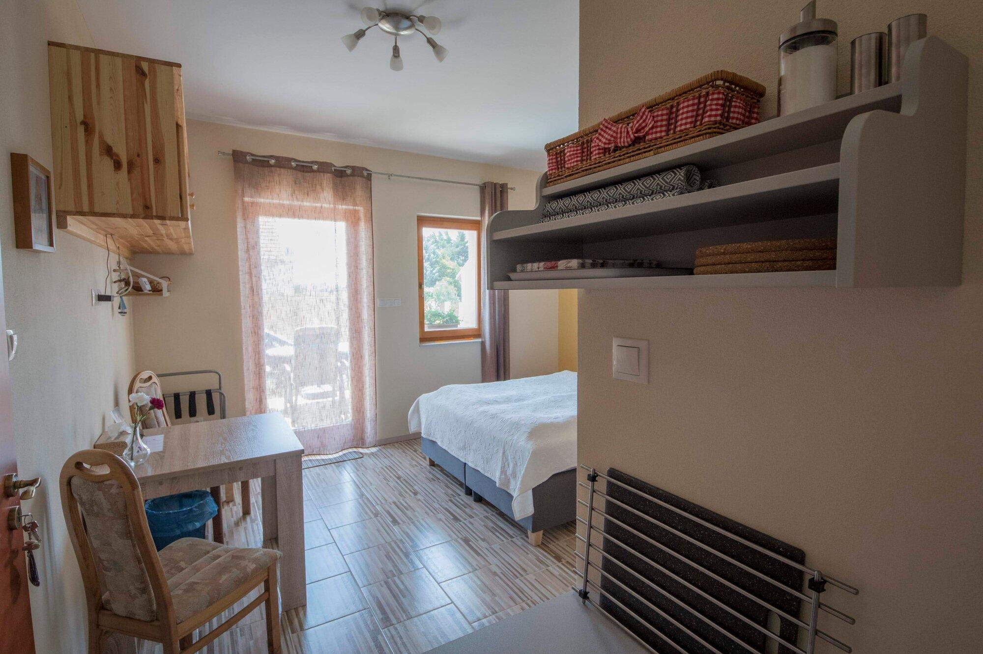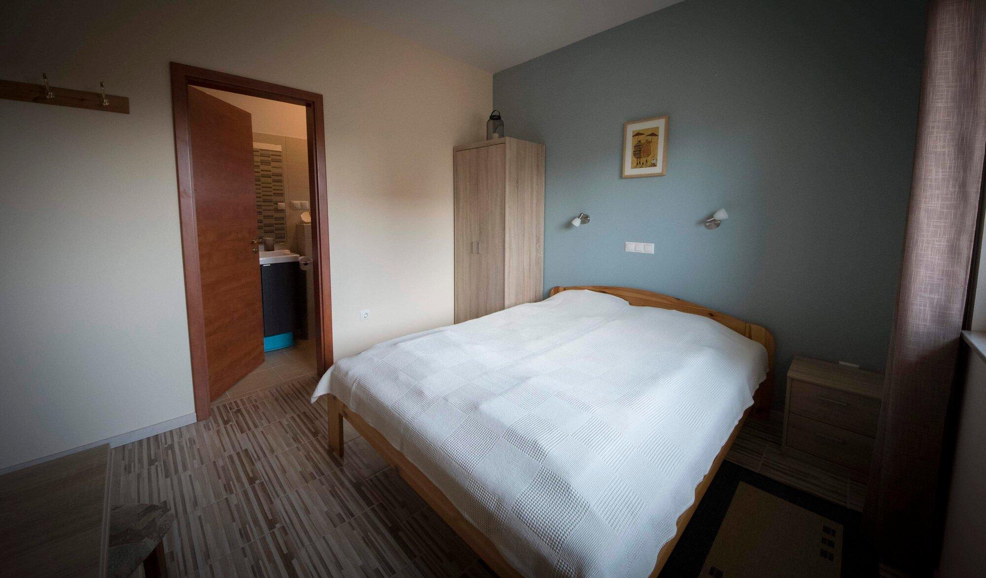 Appartement (45 m2): modern eingerichtetes Appartement bestehend aus 2 Zimmern (Gästezimmer und Gästestudio siehe unten) mit Rollläden, Vorzimmer, 2 x Dusche/WC, einer Miniküche und Terrasse. Das Appartement befindet sich in einem in 2017 erbauten Einfamilienhaus, und ist durch eine schallgedämpfte Tür vom Wohnbereich der Eigentümer getrennt. Für max. 4 Erwachsene buchbar, Zusatzbett nicht möglich. Gästezimmer (11 m2): mit Doppelbett (160 x 200 cm), Kleiderschrank, SAT TV, Tisch mit Stühlen. Badezimmer (3,2 m2) mit Dusche, WC, Handwaschbecken und Föhn. Gästestudio (15 m2): mit Doppelbett (160 x 200 cm), Kleiderschrank, Oberschrank, SAT TV, Tisch mit Stühlen, möblierte Terrasse. In der Nische (1,2 m2) befindet sich die Miniküche mit 2 Kochplatten, Kühlschrank, Wasserkocher, Kaffeemaschine und Küchengeschirr. Badezimmer (4,2 m2) mit Dusche, WC, Handwaschbecken und Föhn.