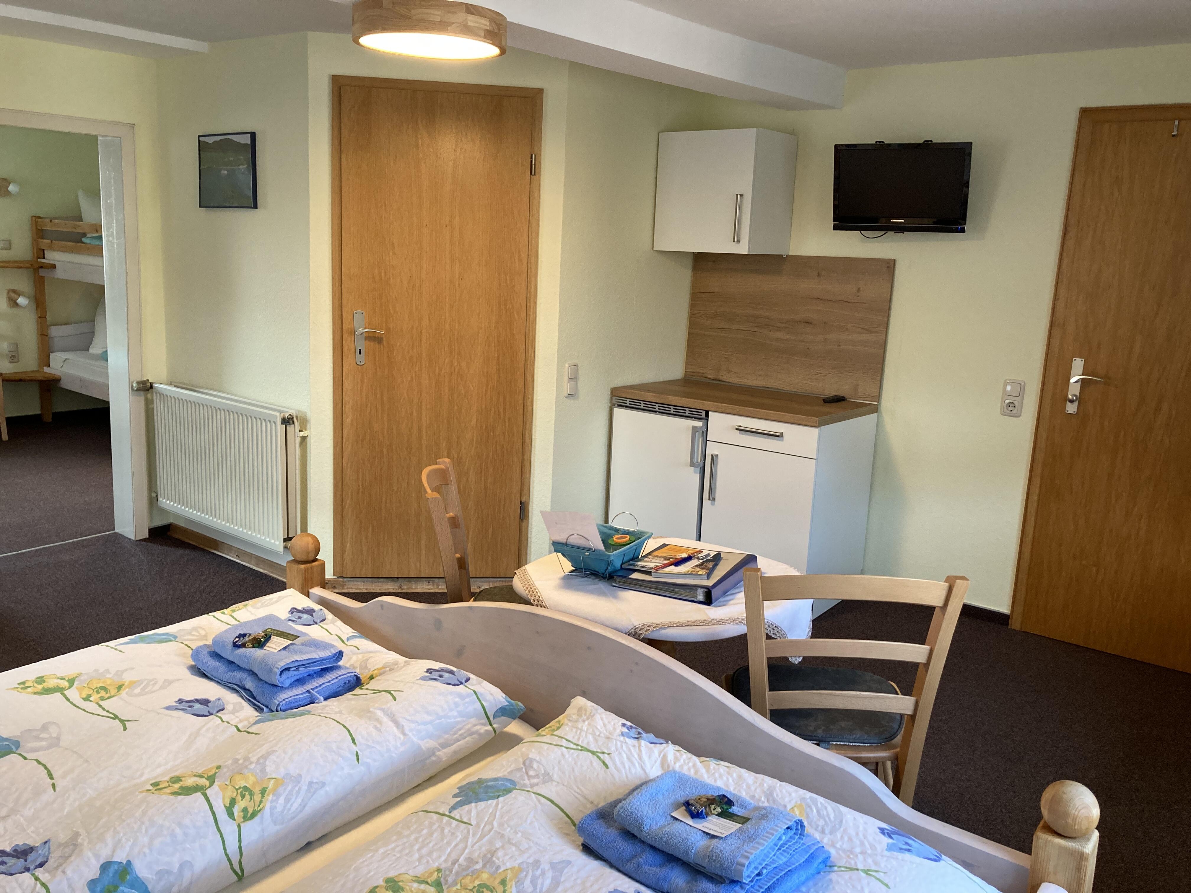 Unser ehemaliger Kuhstall (bzw. der früher darüber liegende Heuboden) beherbergt 6 Ferienwohnungen in unterschiedlicher Größe. Alle Ferienwohnungen sind ausgestattet mit komplett eingerichteter Wohnküche, einem oder zwei Schlafräumen, Dusche/WC und überdachtem Balkon. Kleinkindausstattung ist überall vorhanden. W-LAN ist in allen Ferienwohnungen kostenlos verfügbar. Ausserdem stehen Waschmaschine, Trockner (gegen Aufpreis) und Bügeleisen im Hausarbeitsraum zur Verfügung. Die genannten Preise verstehen sich inkl. aller Nebenkosten (Strom, Wasser, Heizung, Endreinigung) bis zur genannten Personenzahl. Jede weitere Person 15,- €/Nacht. Handtücher und Bettwäsche werden ab 7 Übernachtungen gestellt. Bei kürzeren Aufenthalten können Sie die Wäsche mitbringen oder für 13,- €/Person/einmalig von uns bekommen.