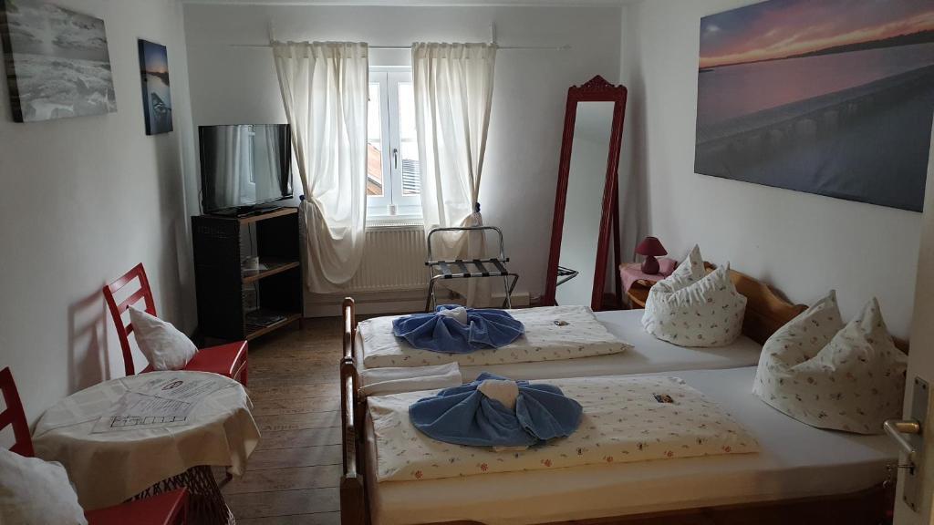 10 Zimmern, darunter 2 Einzelzimmer, 1 Dreibettzimmer und 1 Appartment, teilweise mit Fernseher, Bad oder Waschgelegenheit.