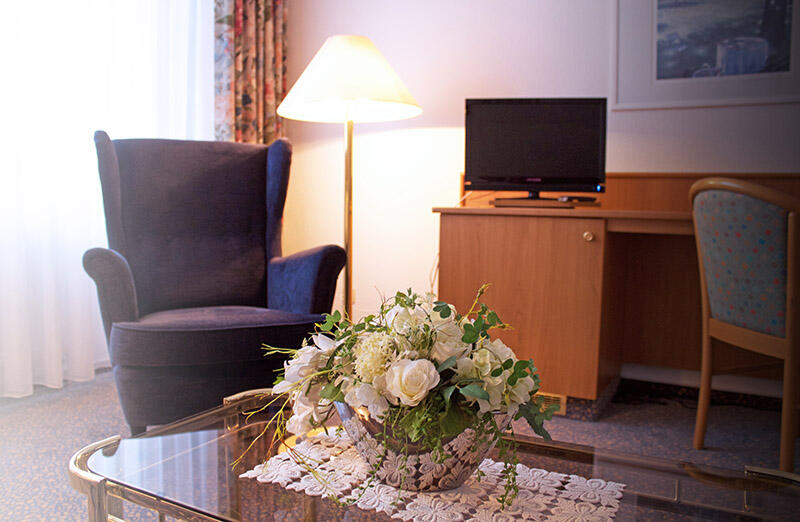 Dieses Zimmer besitzt einen zusätzlichen Wohnbereich und ist zusätzlich mit einer Badewanne ausgestattet.