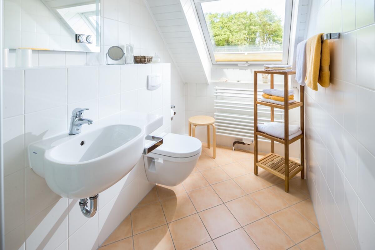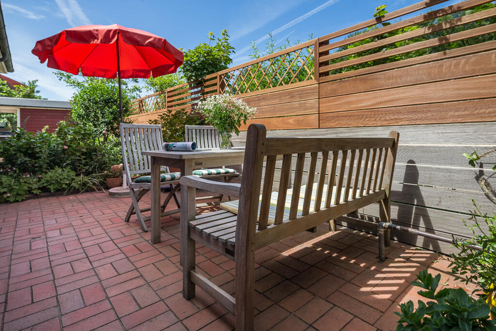Die Terrasse ist mit modernen Lounge Möbeln und einem Sonnenschirm und Sonnenliegen ausgestattet. Eine Grillmöglichkeit ist vorhanden. In der Wohnung ist im Erdgeschoß ein blau/weiß gefliestes Duschbad mit Fenster und Handtuchhalter als Heizung. Ein weiteres Duschbad befindet sich im Obergeschoß.