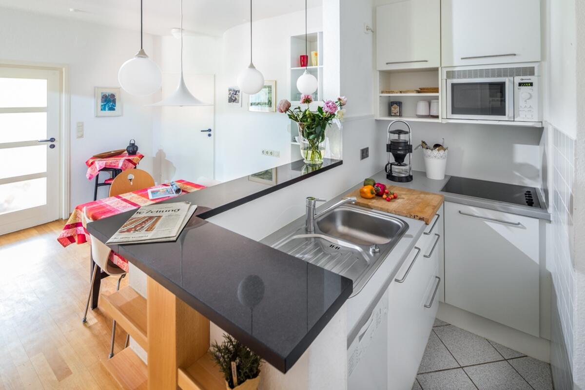 Im hellen Wohnbereich befindet sich ein Sofa mit zwei gemütlichen Sesseln, einem Flachbildschirm sowie einer modernen offenen Einbauküche mit Essbereich, sowie der Zugang zu Terrasse. Geschirrspüler und Mikrowelle sind selbstverständlich vorhanden.