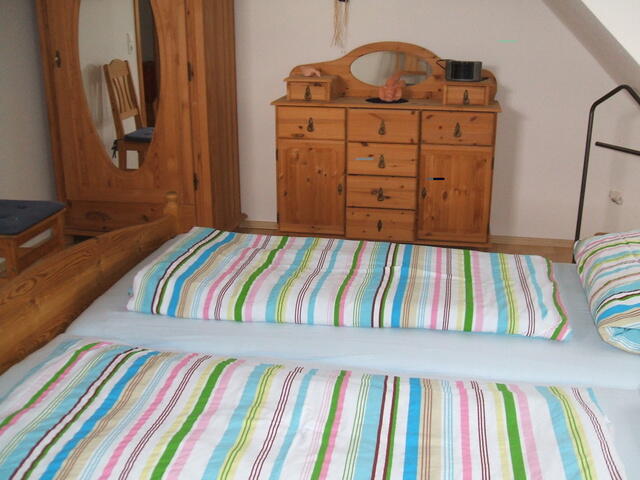 Im Obergeschoss gibt es 2 Schlafzimmer (1 x Doppelbett, 1 x 2 Einzelbetten), das Bad hat DU/WC, Waschtisch, Föhn. Im ausgebauten Spitzboden befindet sich das 3. Schlafzimmer mit 2 Einzelbetten.