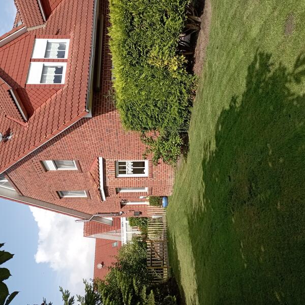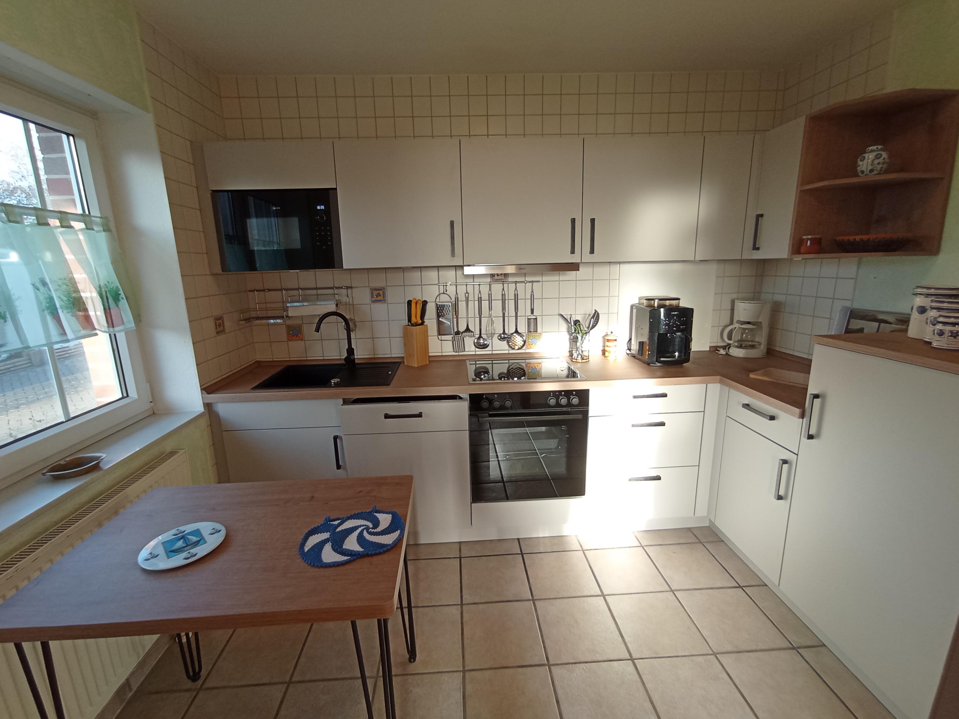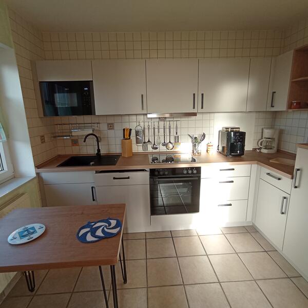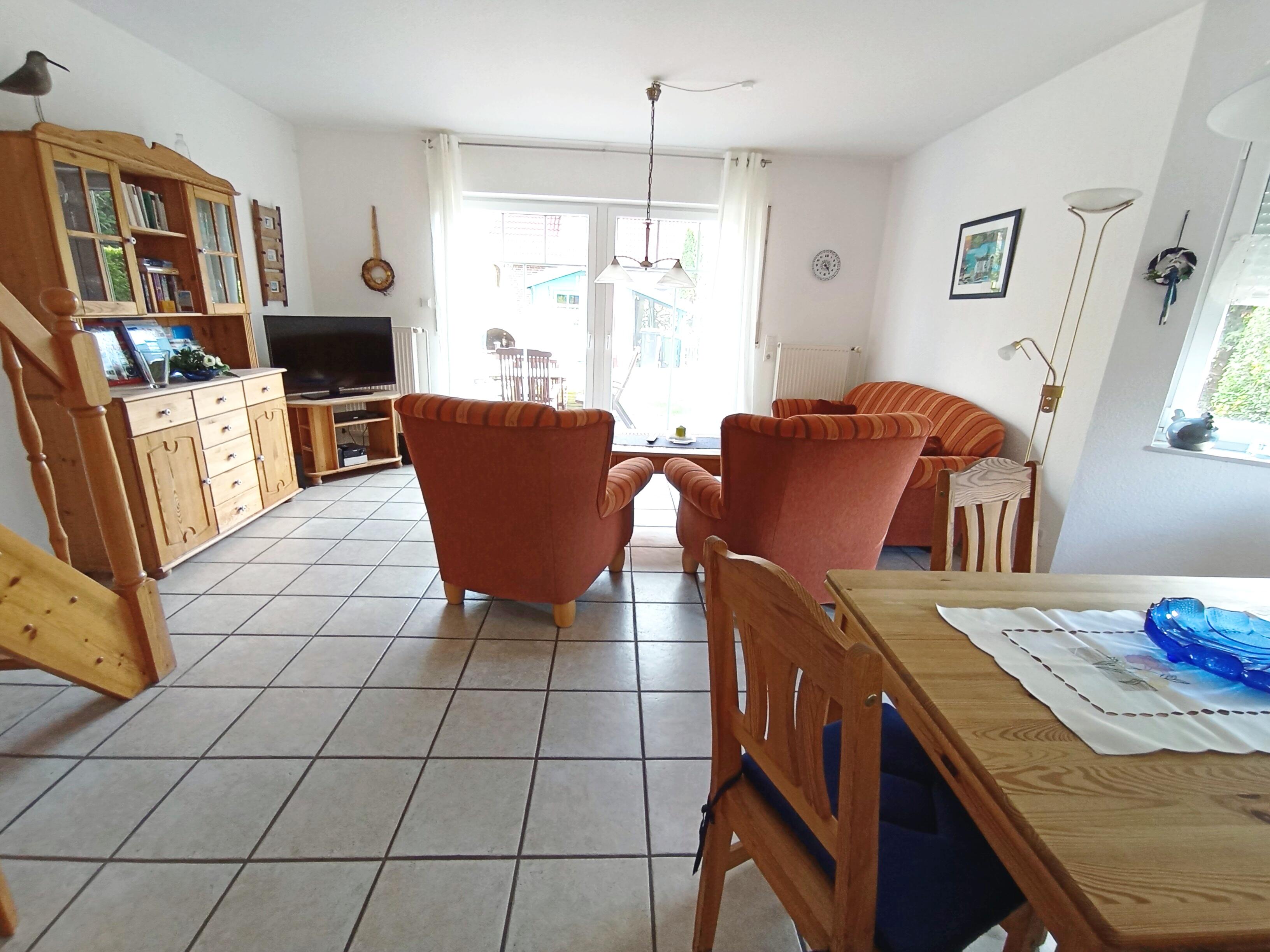 Im Erdgeschoss befinden sich Flur, kleine Abstellkammer mit Waschmaschine, Gäste-WC, Küche mit kompletter Küchenzeile, der Wohnraum mit Essecke im Erker, Ausgang zu Terrasse mit Grillkamin und Gartentisch mit Stühlen und Strandkorb. Im Gartenhaus befinden sich 4 Fahrräder zur kostenlosen Nutzung und eine Tischtennisplatte.