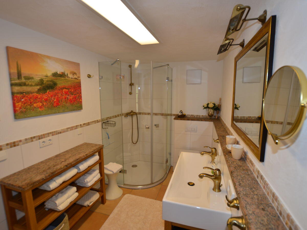 Das schicke Badezimmer mit Glasduschkabine und Doppelwaschtisch bietet genügend Platz für die tägliche Hygiene.