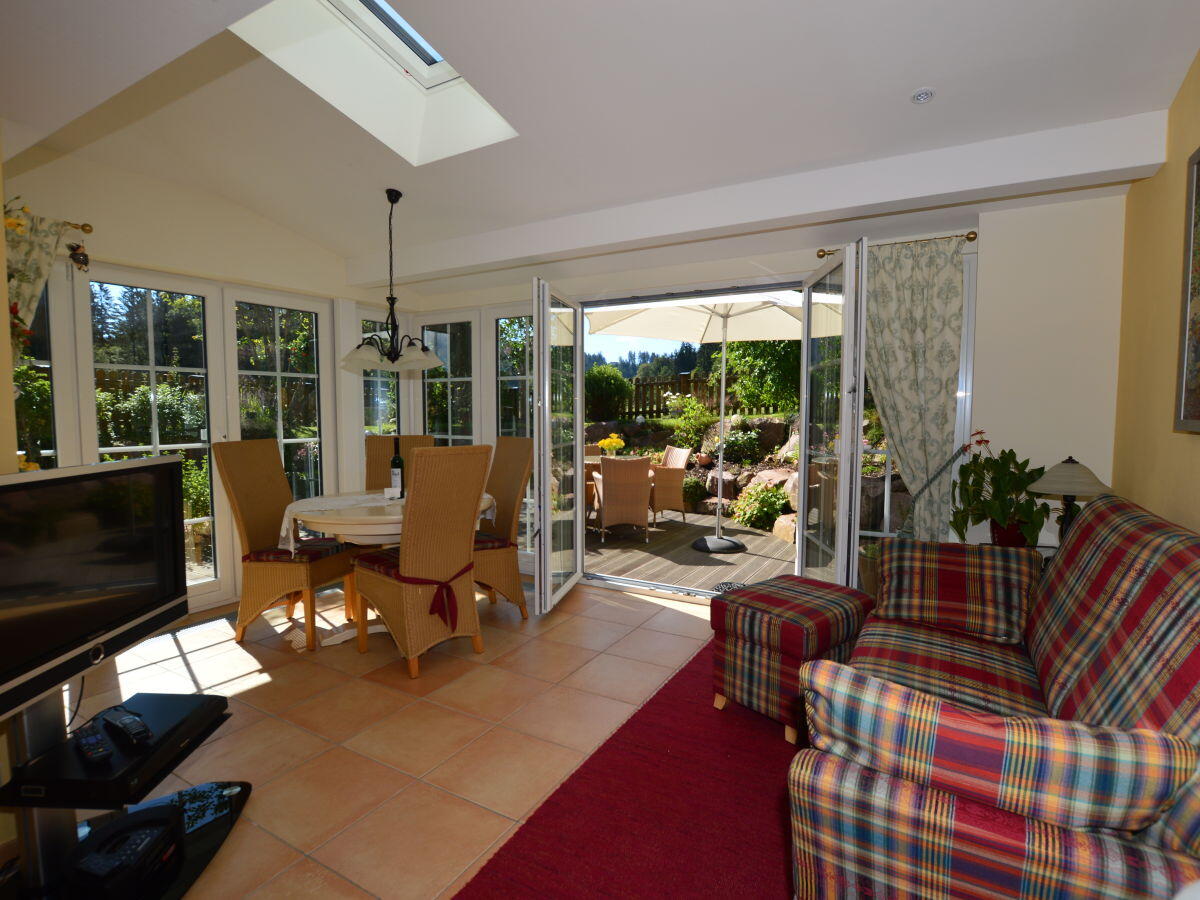 Der Ess- und Wohnbereich dieser wunderschönen Ferienwohnung ist durch die helle lichtdurchflutete Fensterfront direkt mit dem Garten verbunden.