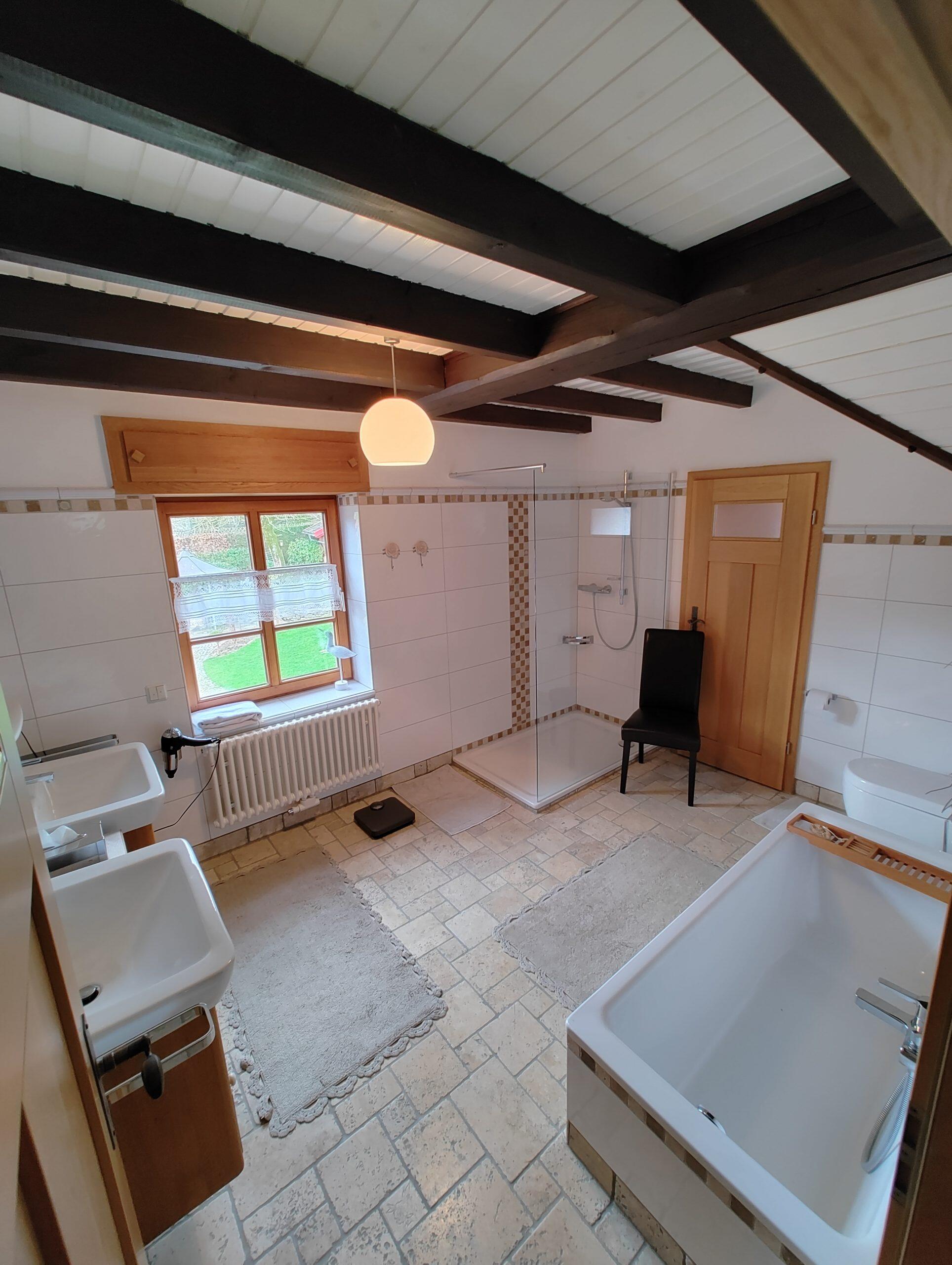 Großes Bad (Dusche und Wanne, zwei Standbecken, Radio).