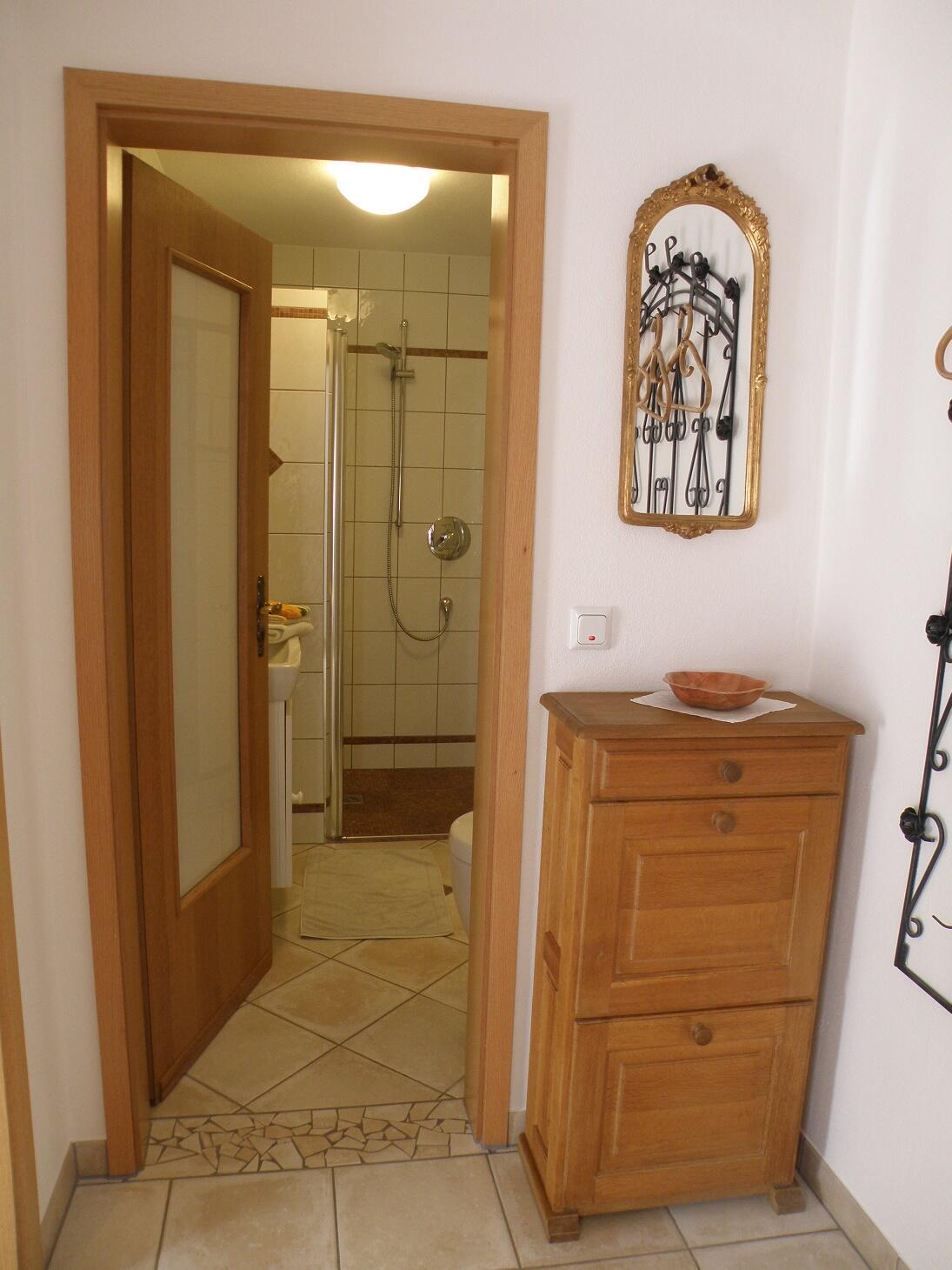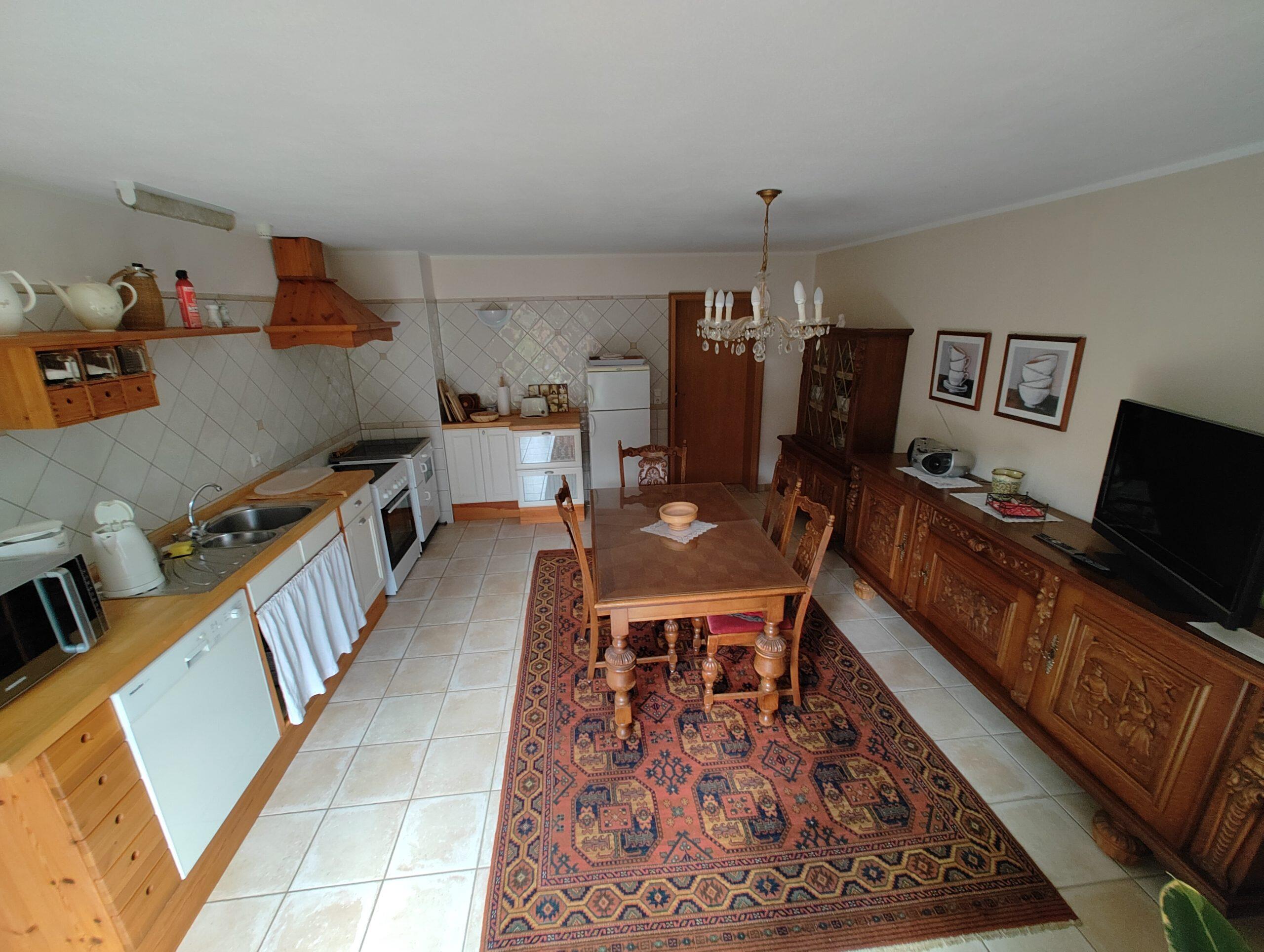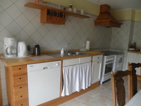 Wohnküche (Küchenzeile, Spülmaschine, E-Herd mit Ceranfeld, Backofen, Mikrowelle, Kaffeemaschine, separater Standkühlschrank mit Gefrierfach, SAT TV), Duschbad.