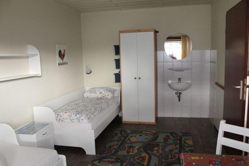 Im Kinderzimmer befindet sich das tolles Hochbett mit Vorhang zum Kuscheln. Darunter steht ein großes Einzelbett. Wenn die Kinder noch nicht im Hochbett schlafen können, stellen wir ein Einzelbett dazu.