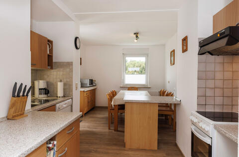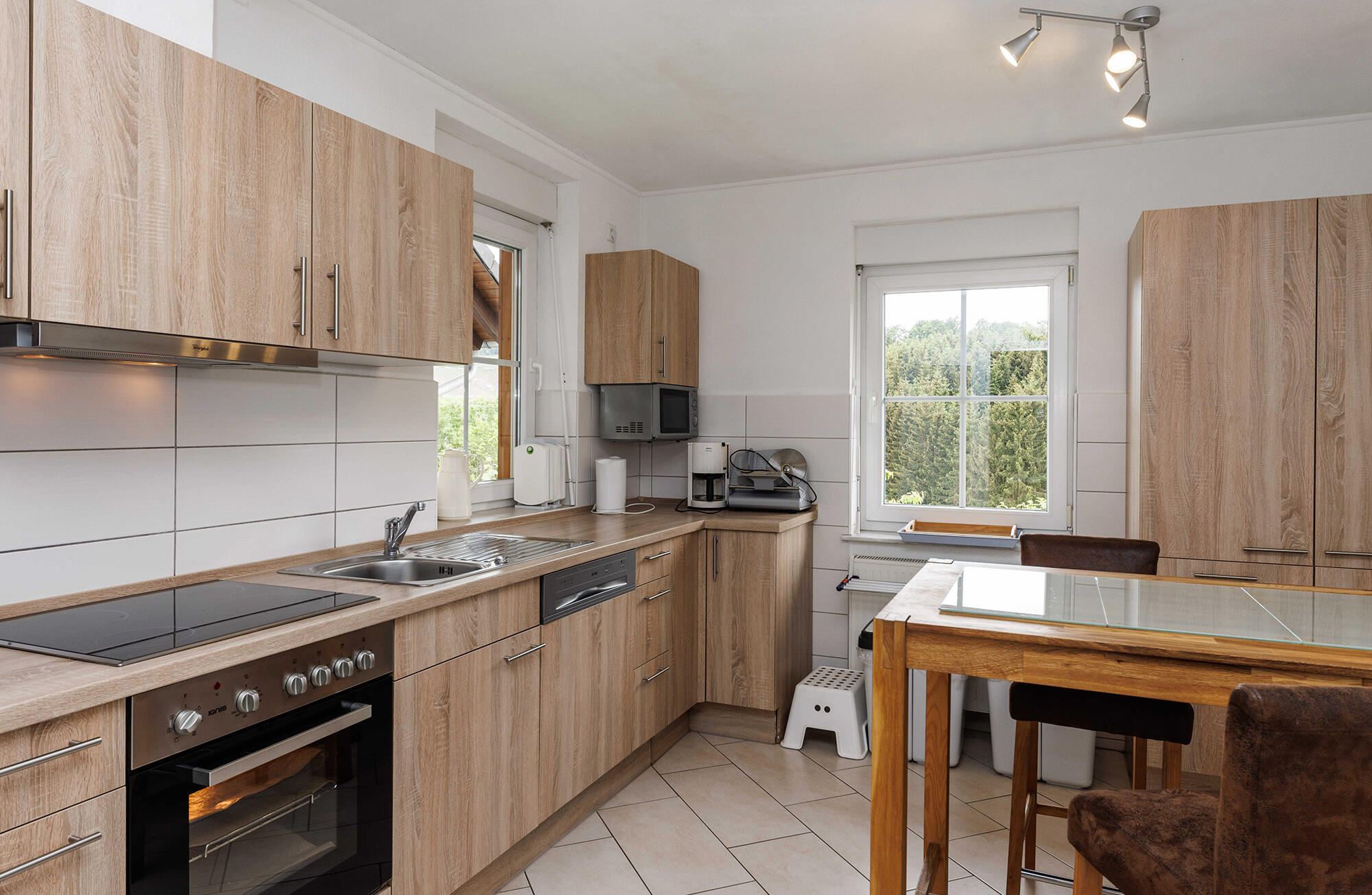 1 Küche mit Ceranfeld, Backofen, Spülmaschine und Kühlschrank mit Gefrierfach