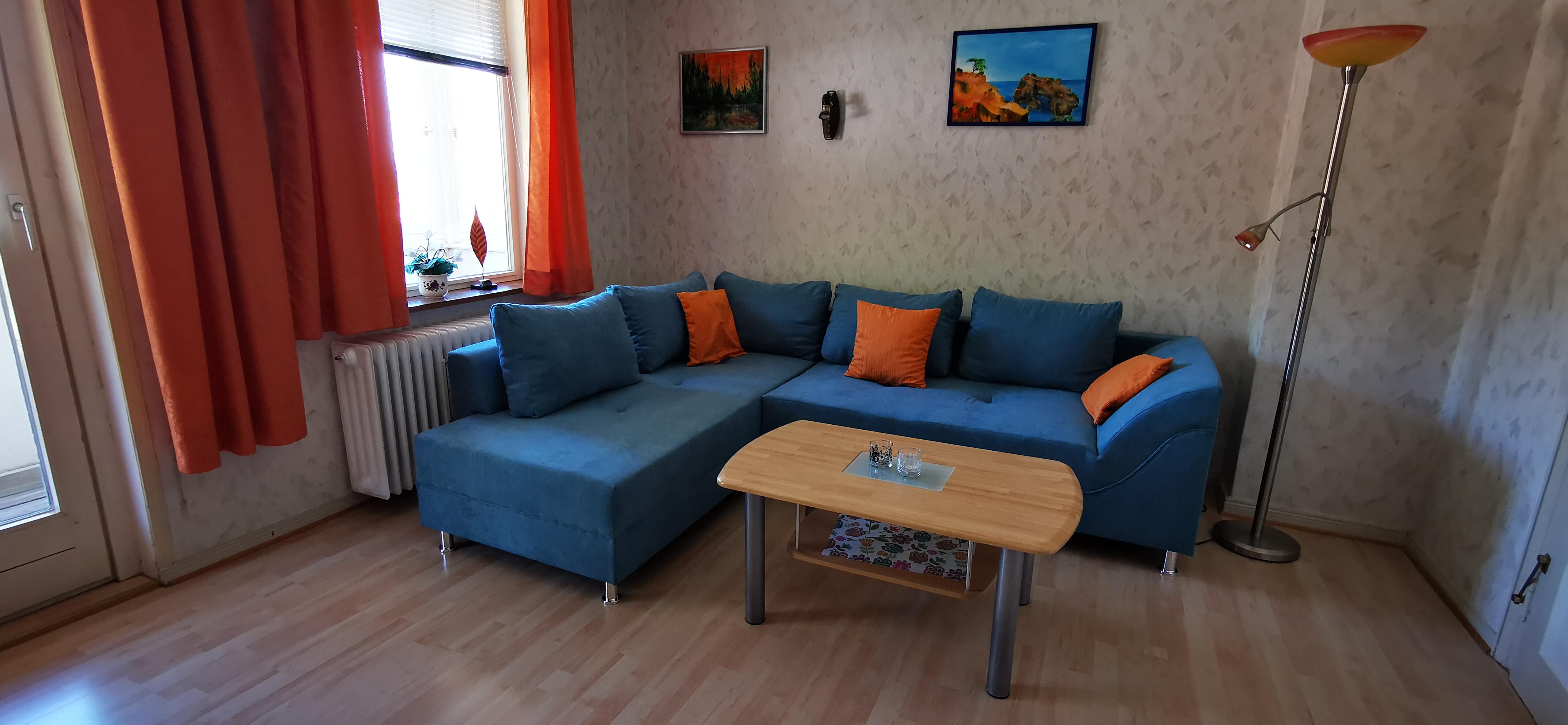 Sie besteht aus Wohnzimmer mit Süd/West- Balkon, Küche, Bad , Flur und 1 Schlafzimmer mit Doppelbett (2m x 2m) und einem Zusatzbett. Im Wohnzimmer finden Sie eine gemütliche Wohnlandschaft, Stereoanlage, Fernsehgerät mit DVB-T Empfänger.