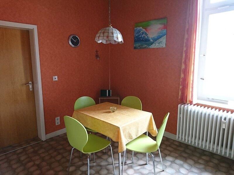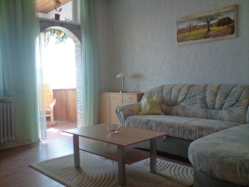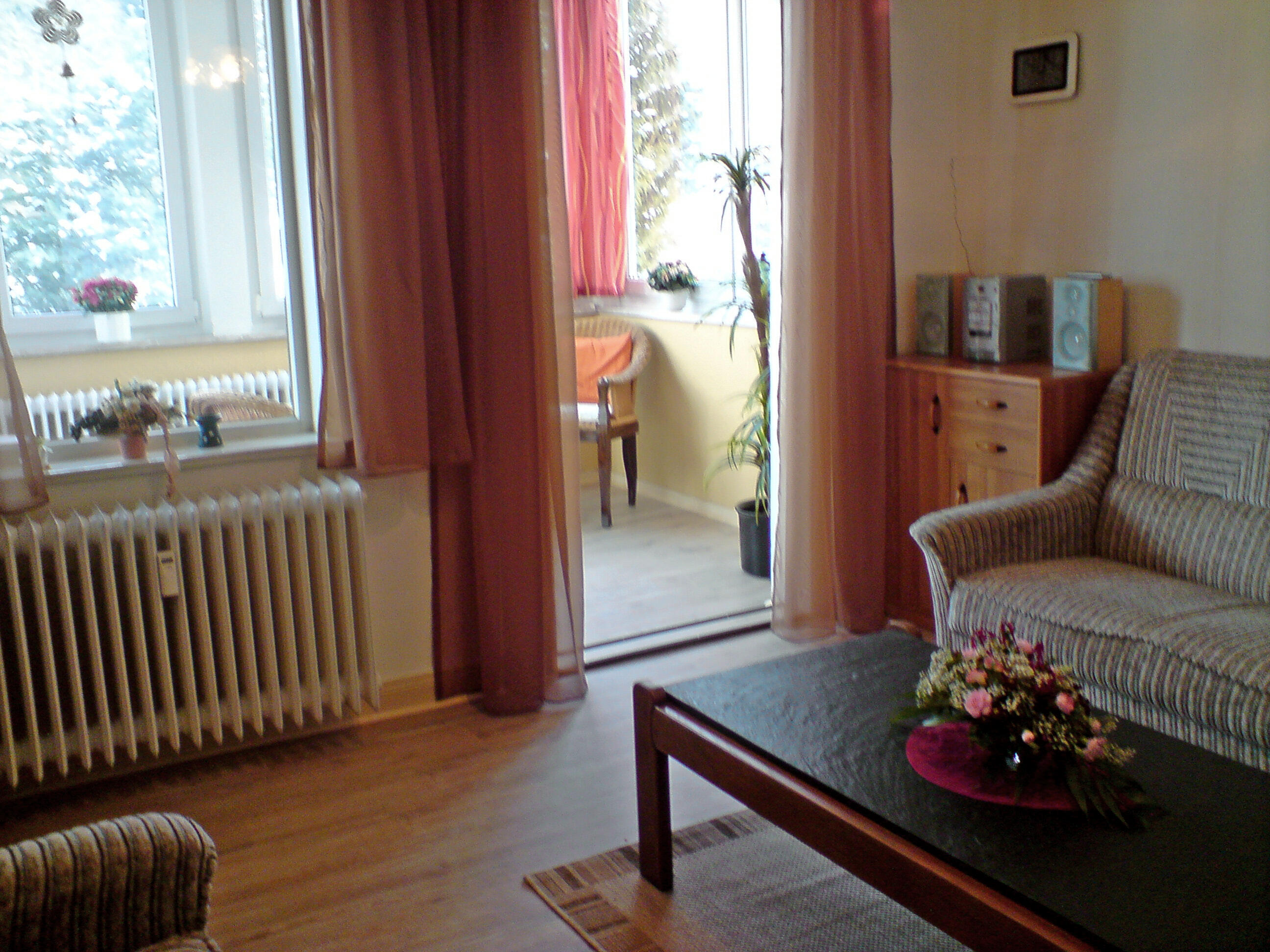 Das Wohnzimmer ist mit Couchgarnitur, Digitalfenseher (DVB-T), Stereoanlage und Eßplatz gemütlich eingerichtet.