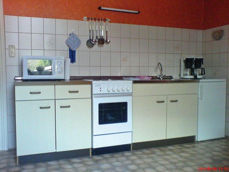 Die Küche ist mit Elektroherd, Kühlschrank, Mikrowelle, Kaffeemaschine, Wasserkocher, Brotschneidemaschine, Handrührgerät, Eierkocher und Toaster komplett eingerichtet.