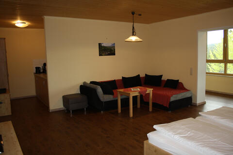 Unser Doppelzimmer ist ca. 28 qm groß und ist ausgestattet mit Doppelbett, Sofa, Bad mit Dusche/WC.