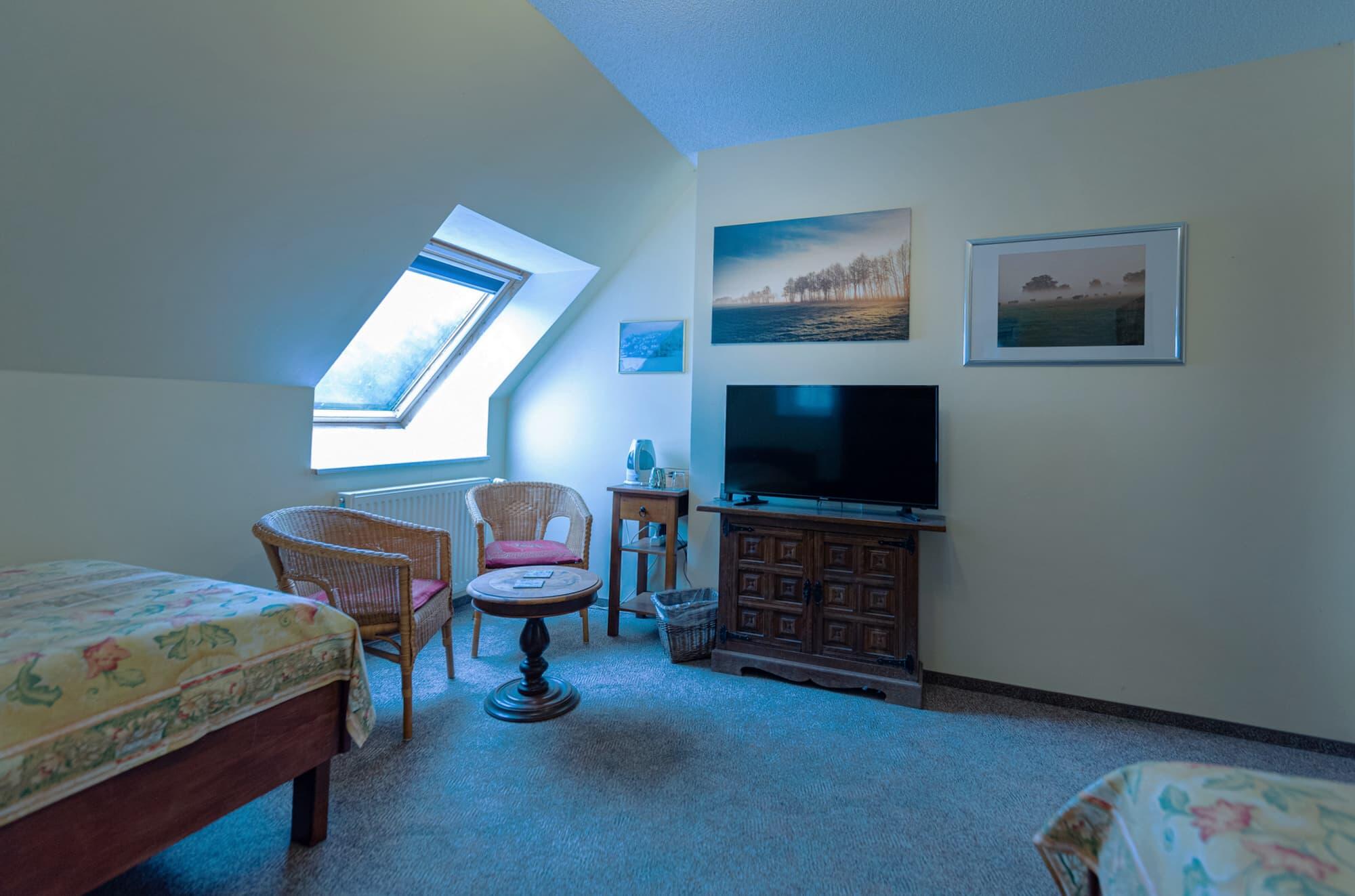 Alle Zimmer sind ausgestattet mit Dusche und WC, ebenso mit Fön und allen Möglichkeiten sich einen Kaffee oder Tee zuzubereiten. Selbstverständlich verfügen alle Zimmer über W-LAN und TV.