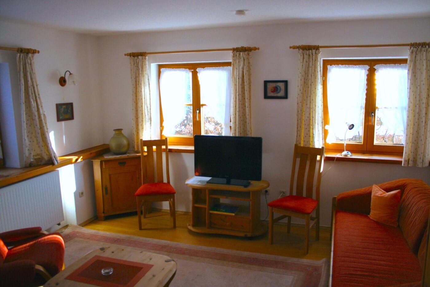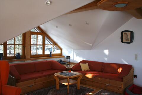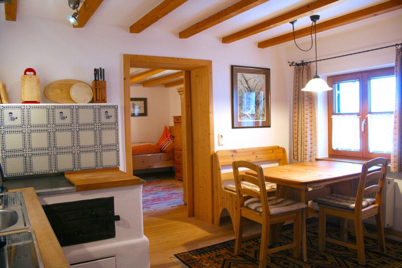 Gemütliche Ferienwohnung (ca. 85 qm) im 1. Stock Wohnraum "Wintergarten", Wohnküche mit Kachelofen, Bad, 2 Schlafzimmer mit je 2 Doppelbetten. Ein kleines zusätzliches Bett (1,60m Länge), Kinderbetten können zugestellt werden.