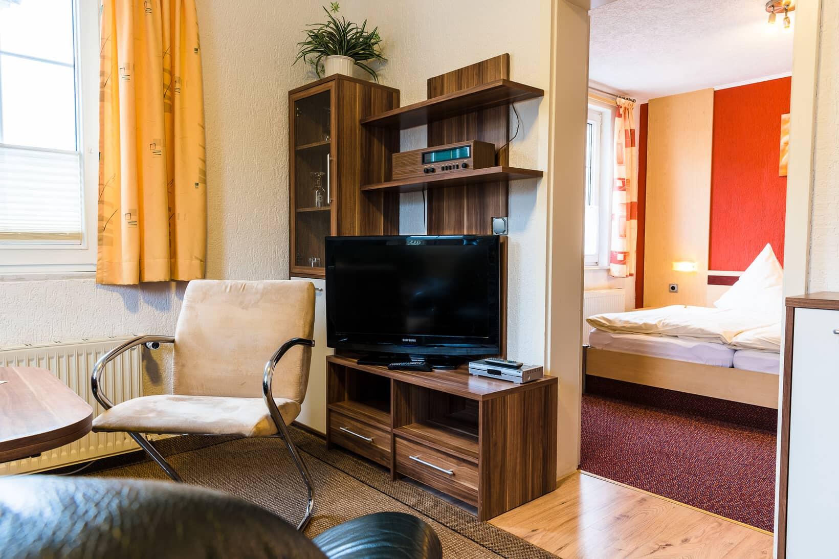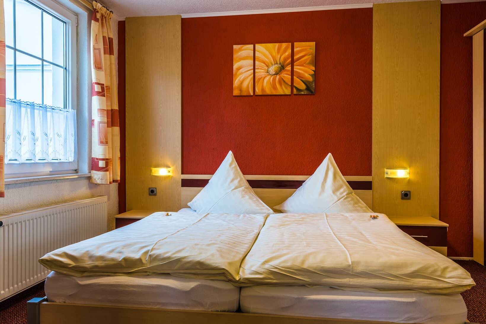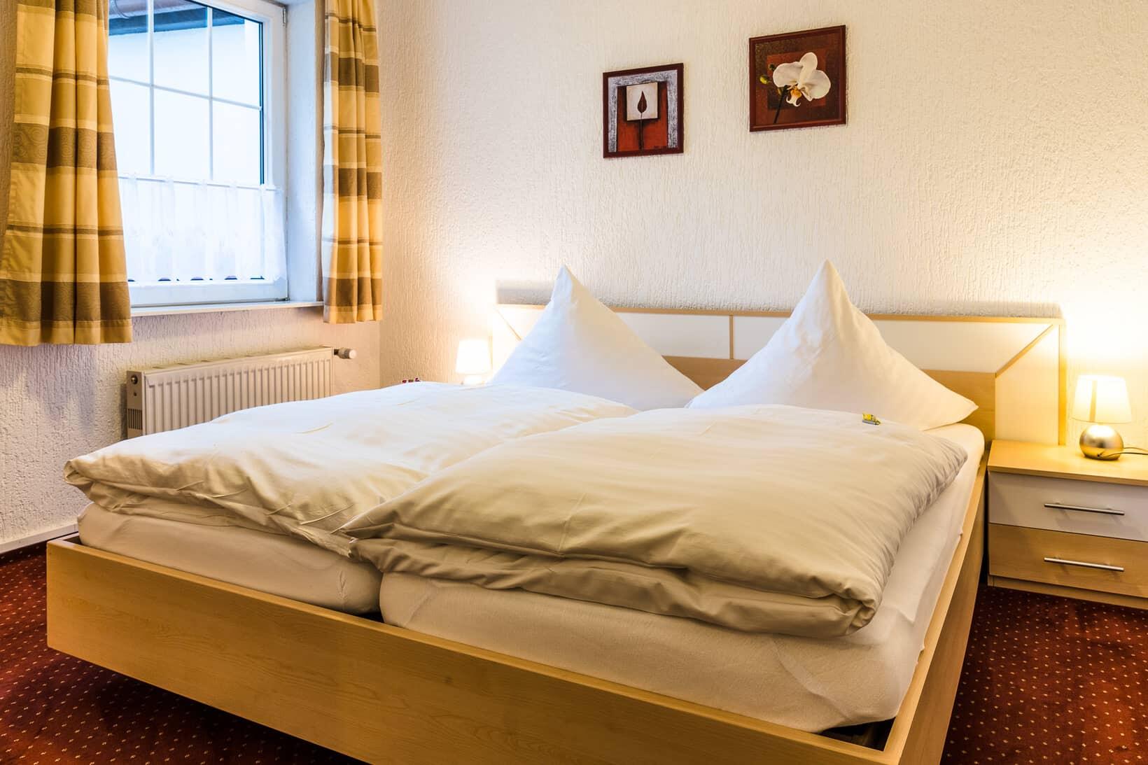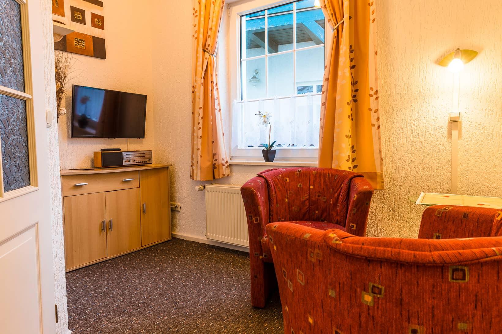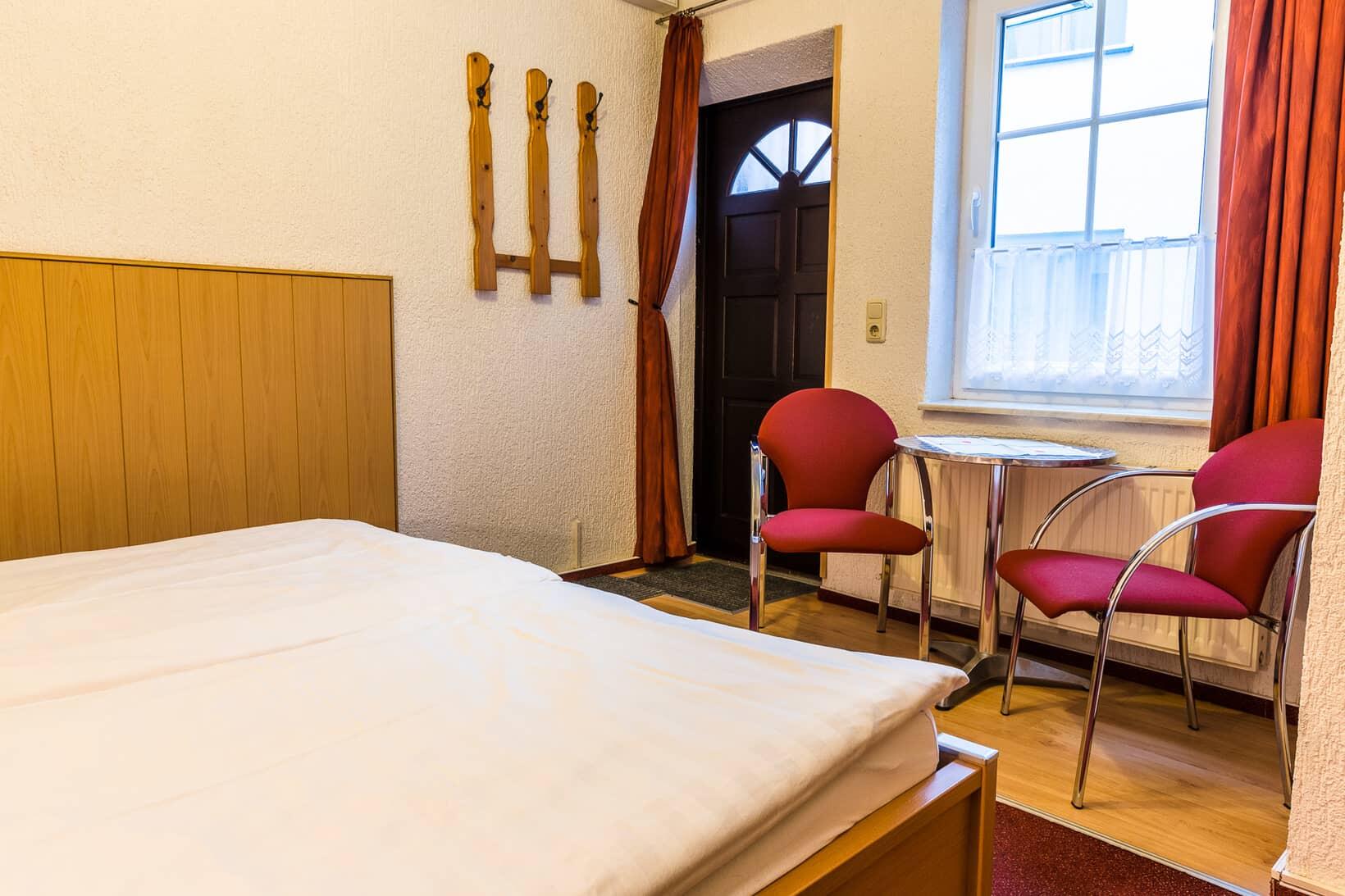 In der im Fachwerkstil erbauten kleinen Pension stehen Ihnen neun Zimmer unterschiedlicher Größe zur Verfügung (Nichtraucher). Sie unterteilen sich in 3 Einzel- , 4 Doppel-, und ein Zwei-Raum-Doppelzimmer (getrennter Wohn- und Schlafbereich) sowie ein Familienzimmer (Wohnzimmer, Eltern-schlafzimmer u. Kinderzimmer mit Doppelstockbett). Alle Zimmer haben Dusche, WC, Radio und Sat-TV und werden täglich gereinigt. Außerdem steht unseren Gästen ein kostenloser Internetzugang über WLAN zur Verfügung.