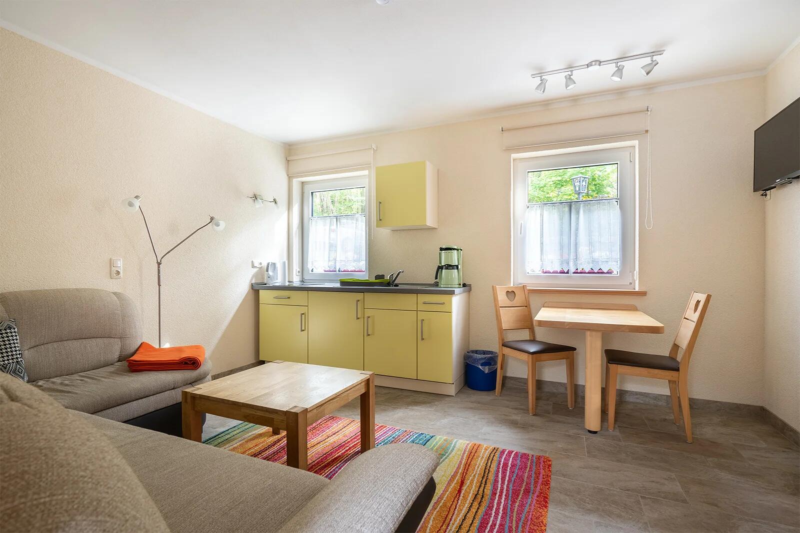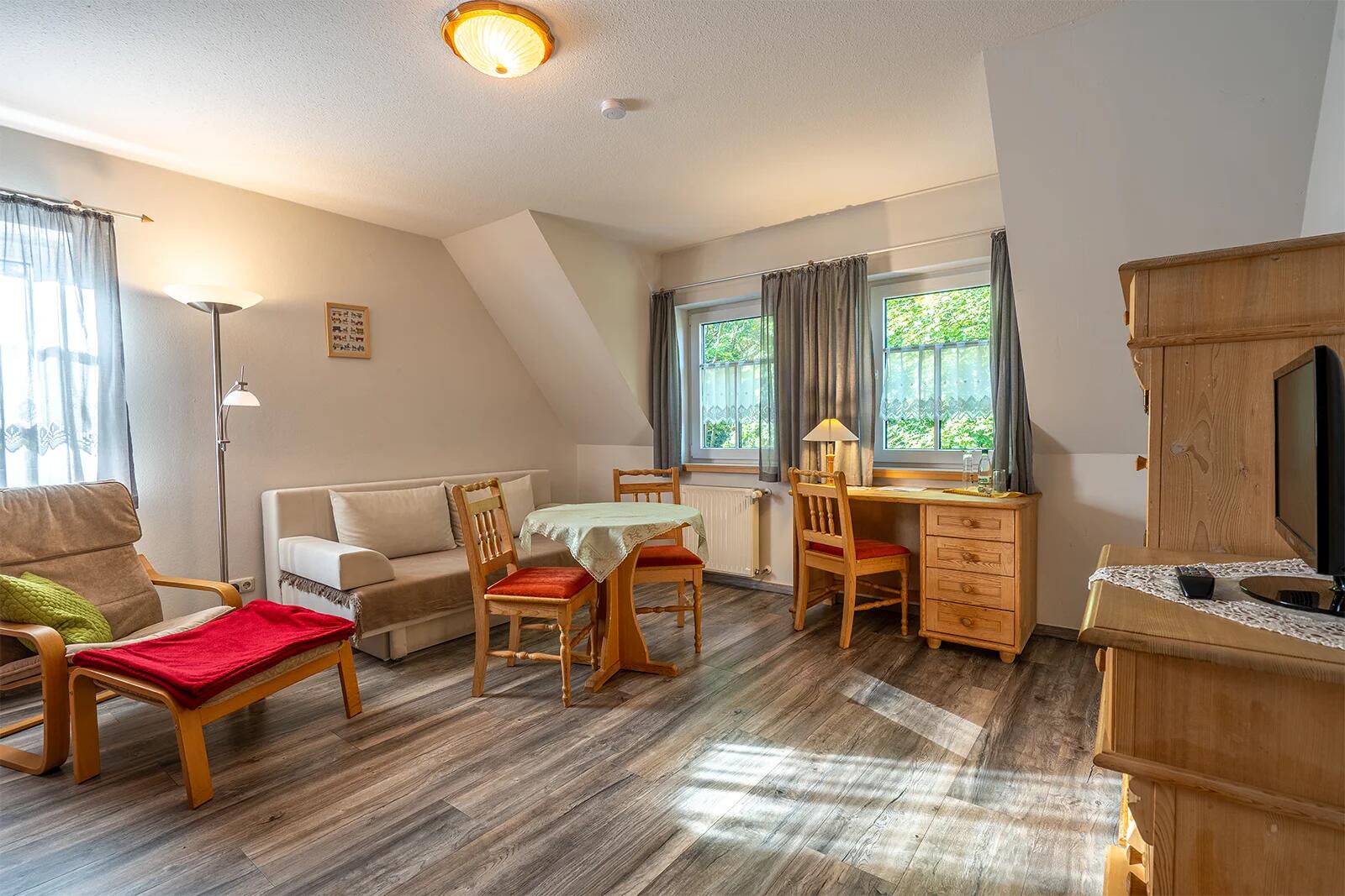 Schnickschnack finden Sie bei uns keinen. Freuen Sie sich auf gemütliche und funktional eingerichtete Zimmer und Appartements, in denen Sie sich nur wohlfühlen können. Gemütliche Holzmöbel, gefertigt in Seiffen, sorgen für wohlige Atmosphäre, hochwertige Matratzen und gemangelte Bettwäsche für einen erholsamen Schlaf und ein praktisches Bad mit Dusche gibt Ihnen den täglichen Frischekick.