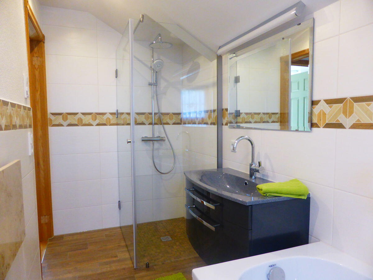 Ein schöner großer Wohnraum mit Parkett und passender Einbauküche, Kamin sowie ein WC mit Waschgelegenheit befinden sich in der 1 Etage. Im Obergeschoss sind 3 Schlafzimmer sowie ein Bad mit Dusche und WC. Eine zusätzliches Schlafzimmer mit 4 Betten und Bad befindet sich im Erdgeschoß.