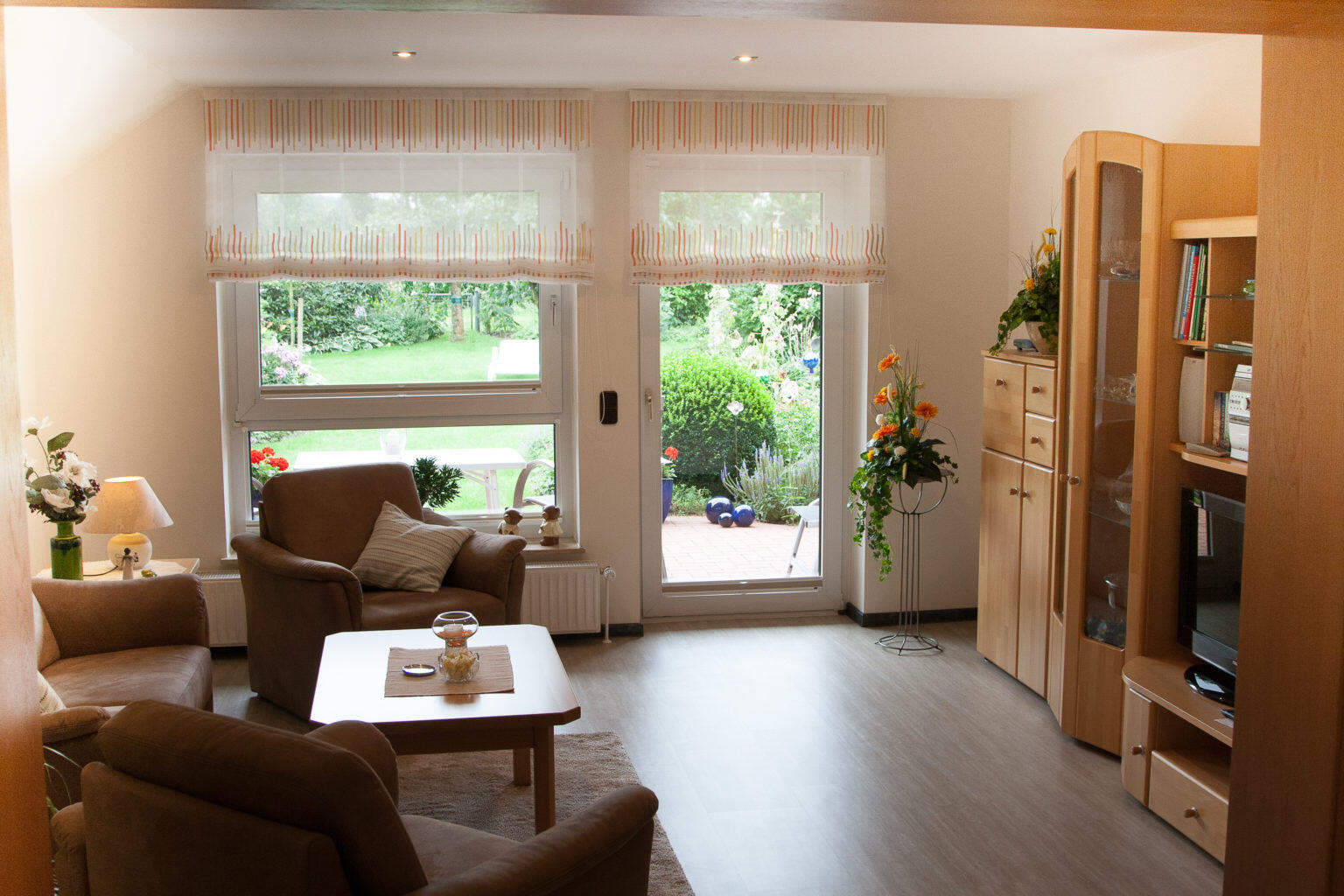 Mit einem gemütlichen Sitzbereich im Wohnzimmer, Sat-Fernsehen und kleiner HiFi-Anlage können Sie einen Urlaubsabend entspannt ausklingen lassen. Auf der gemütlichen windgeschützten Terrasse können Sie weitere schöne Urlaubstage planen. Die Terrasse ist umgeben von einer gepflegten Gartenanlage mit Naturteich. Neben gemütlichen Terrassenmöbeln stehen auch Liegen zur Verfügung.