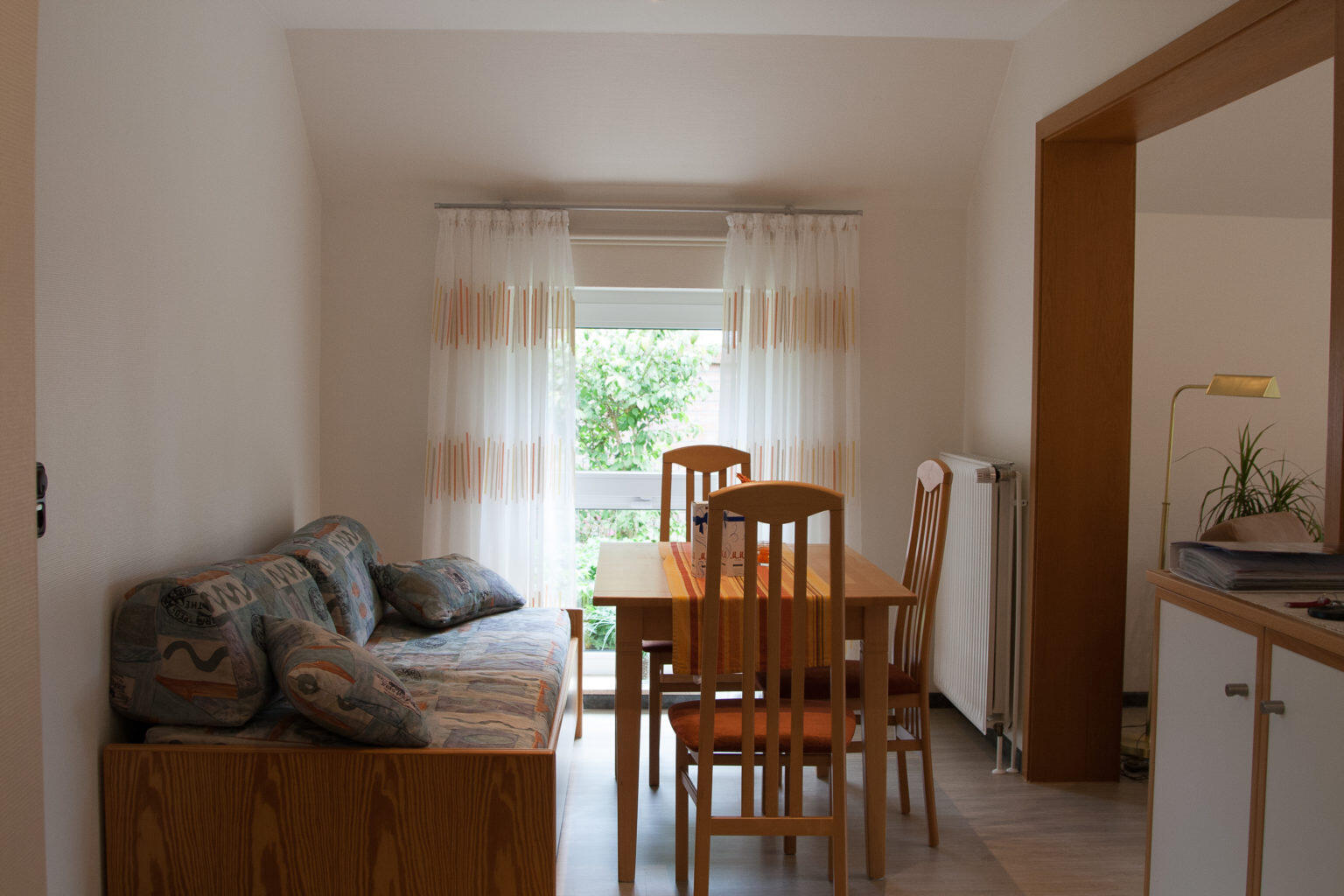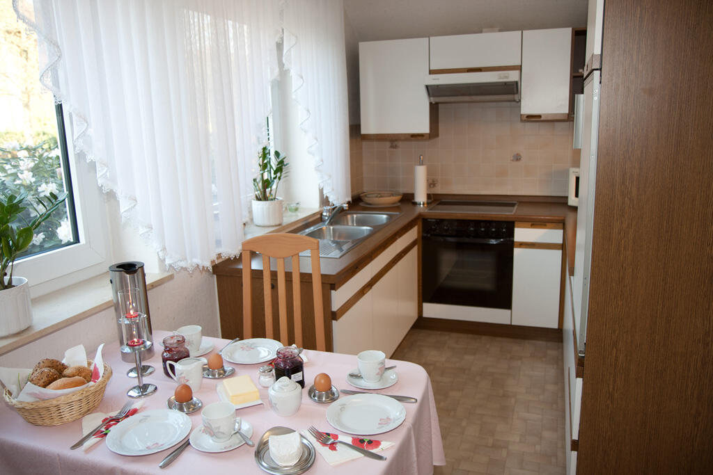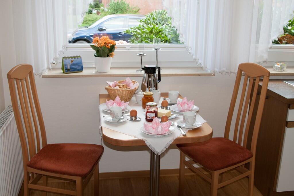 Die Wohnung verfügt über eine separate funktionelle Einbauküche, Badezimmer, Schlafzimmer mit einem Doppelbett in Komforthöhe und Wohnzimmer mit Essbereich. Außerdem umfasst unser Angebot eine Südterrasse mit Markise. Sie ist geeignet für 2 – 3 Personen. Unsere Feriengäste haben freien W-Lan-Anschluss. Haustiere können wir nicht aufnehmen. Da wir ein Nicht-Raucher-Haus sind, bitten wir Sie, bei Bedarf auf der Terrasse zu rauchen.